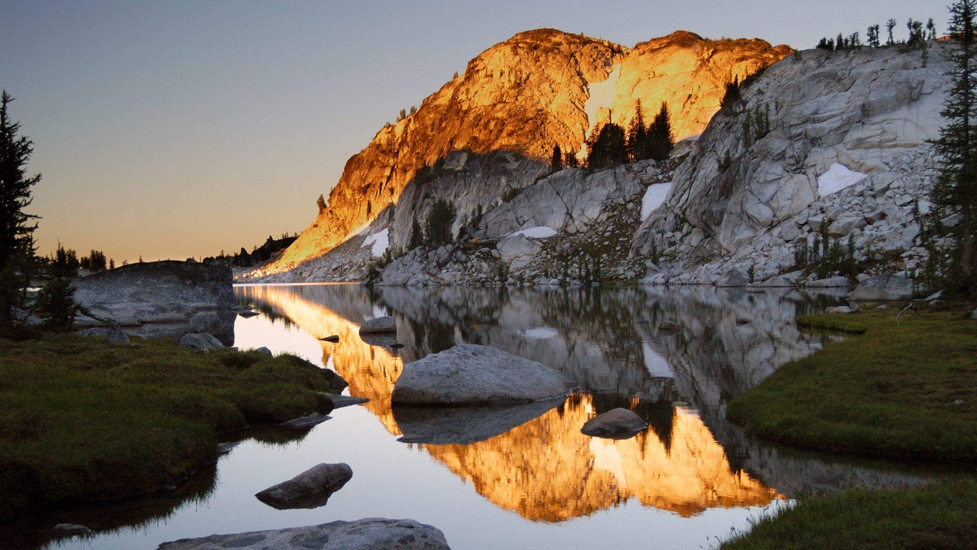 Description: A mountain range with a lake and trees in the foreground and a sunset reflecting on the water and rocks in the foreground.