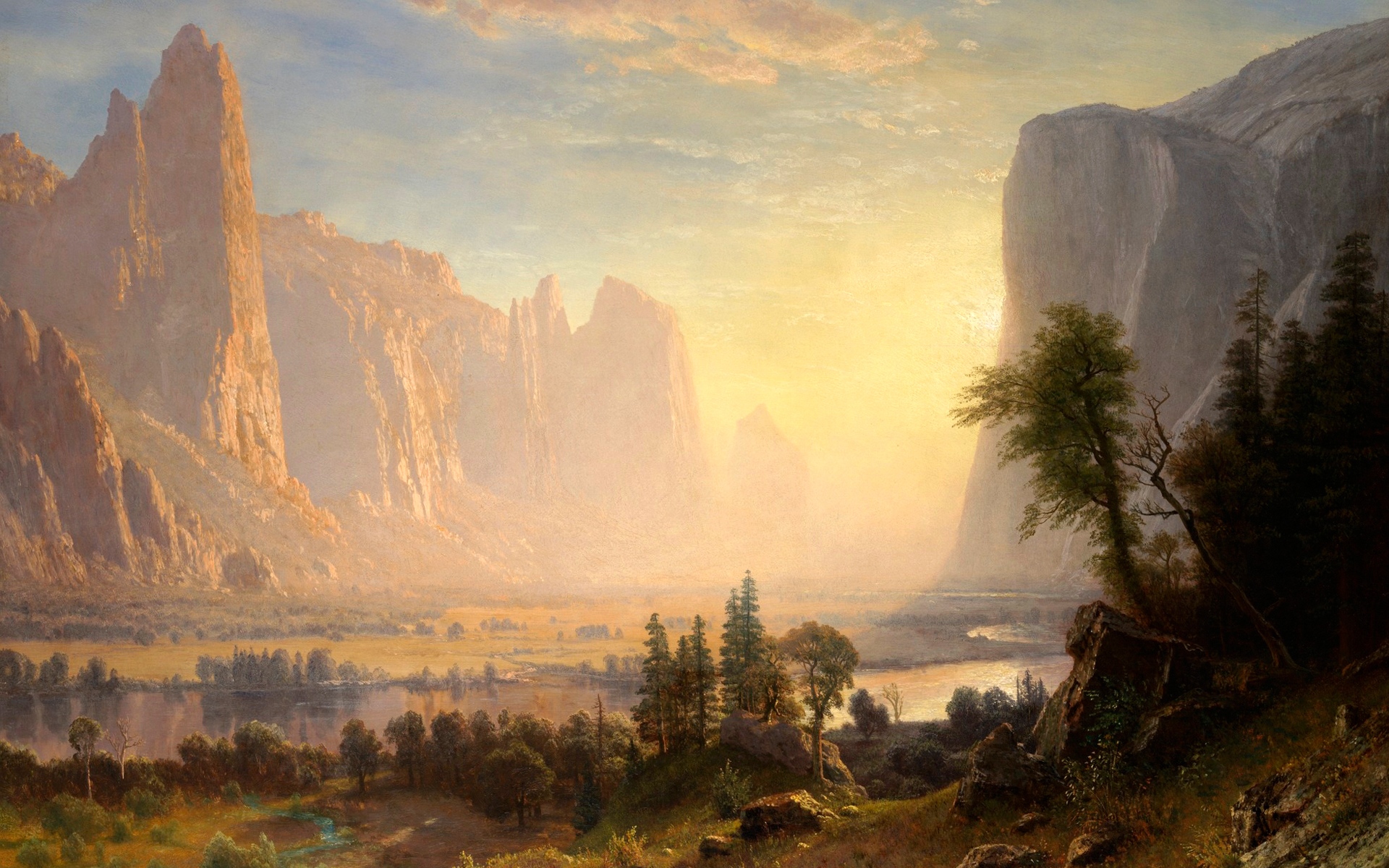 Description: A painting of a mountain landscape with a river and trees in the foreground and a sunset in the background.
