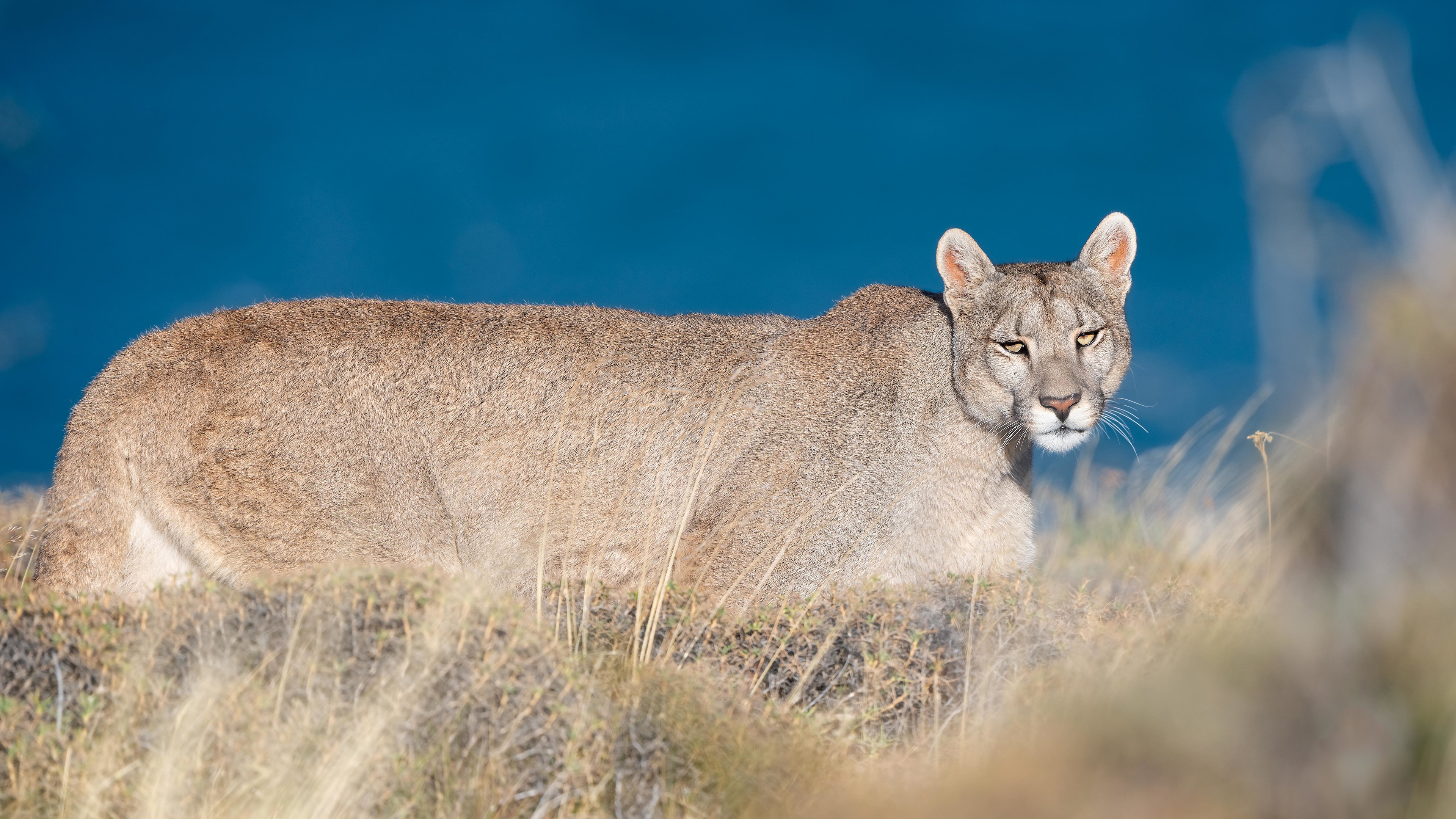 Description: A mountain lion is standing in the grass near the water and bushes.