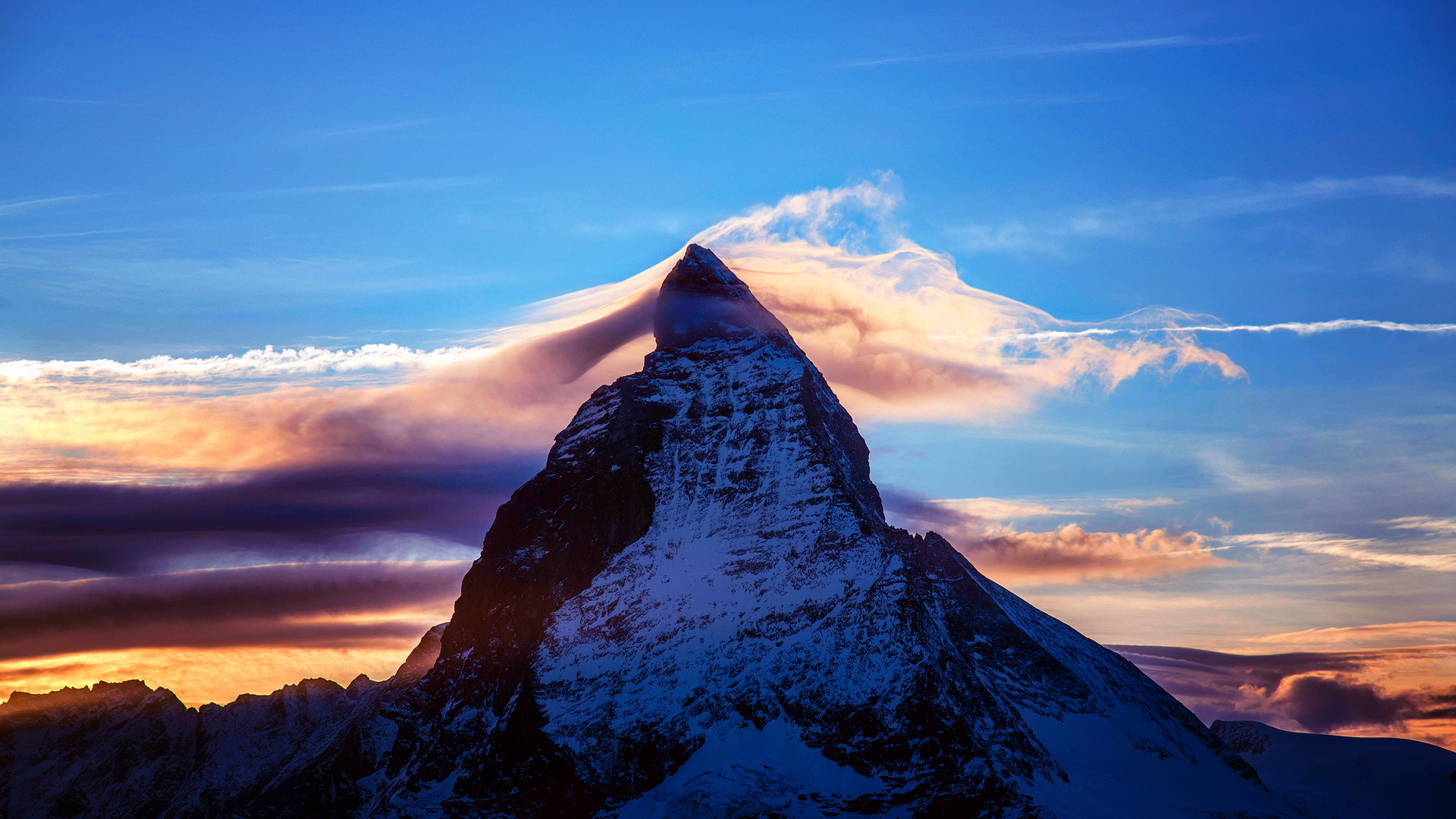 Description: A mountain peak with a cloud formation in the sky above it at sunset or dawn with a single cloud.