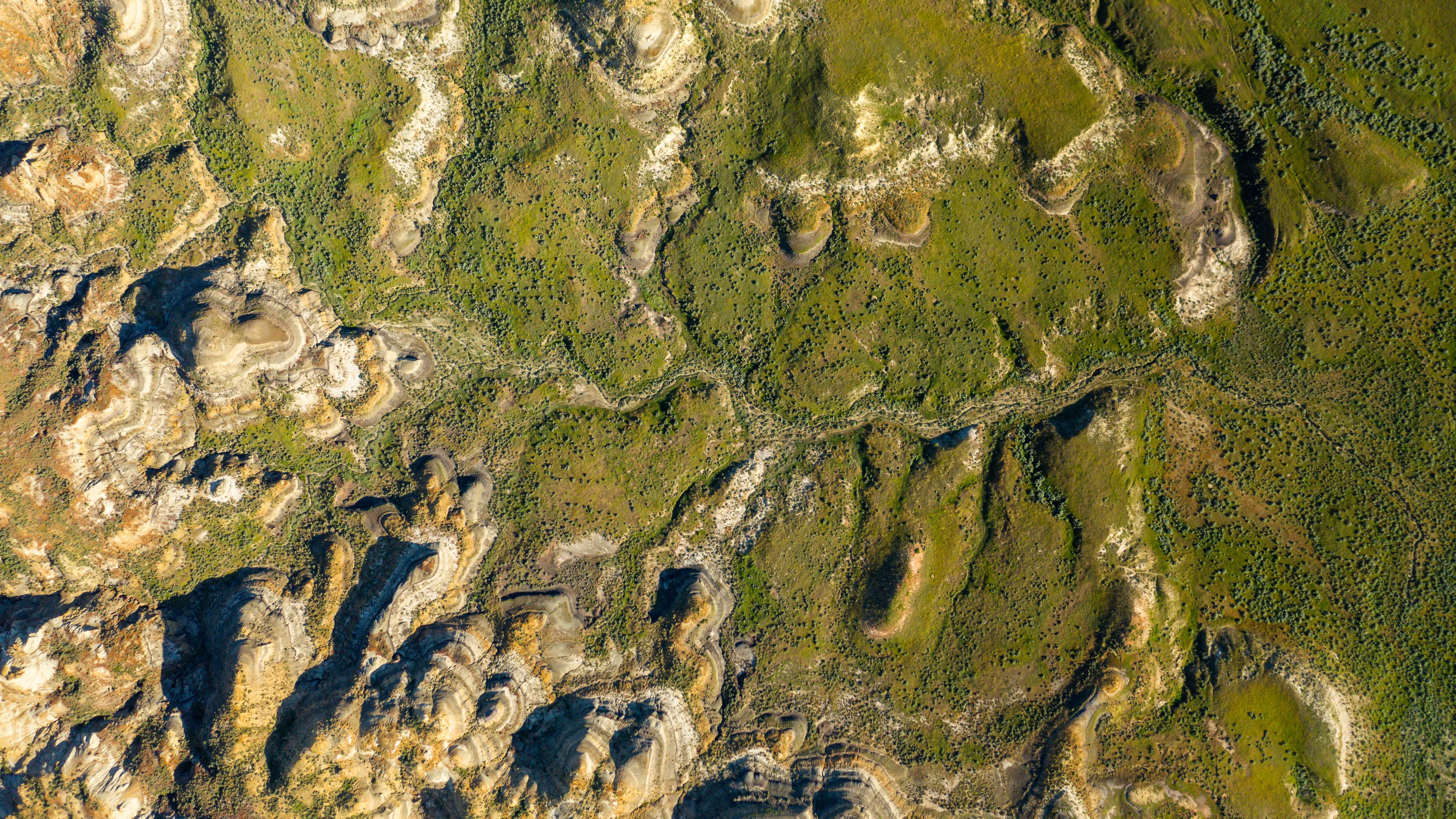Description: A view of a mountain range from a plane window looking down on the ground and the mountains and valleys.