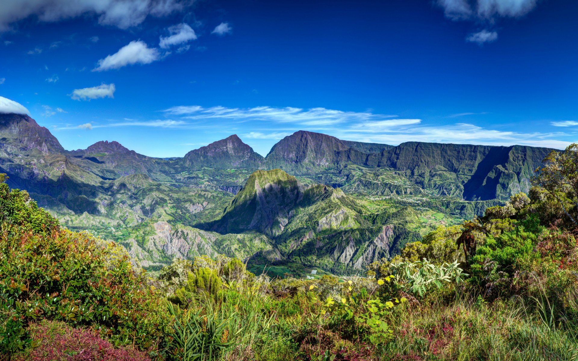 Description: A scenic view of a mountain range with a blue sky in the background and clouds in the sky above.