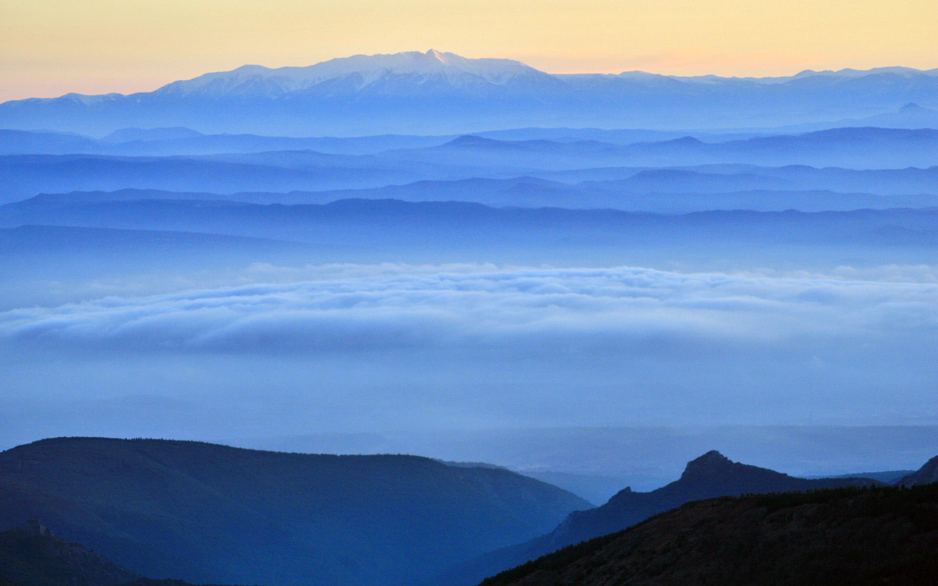 Description: A view of a mountain range with a layer of clouds in the foreground and a few mountains in the background.