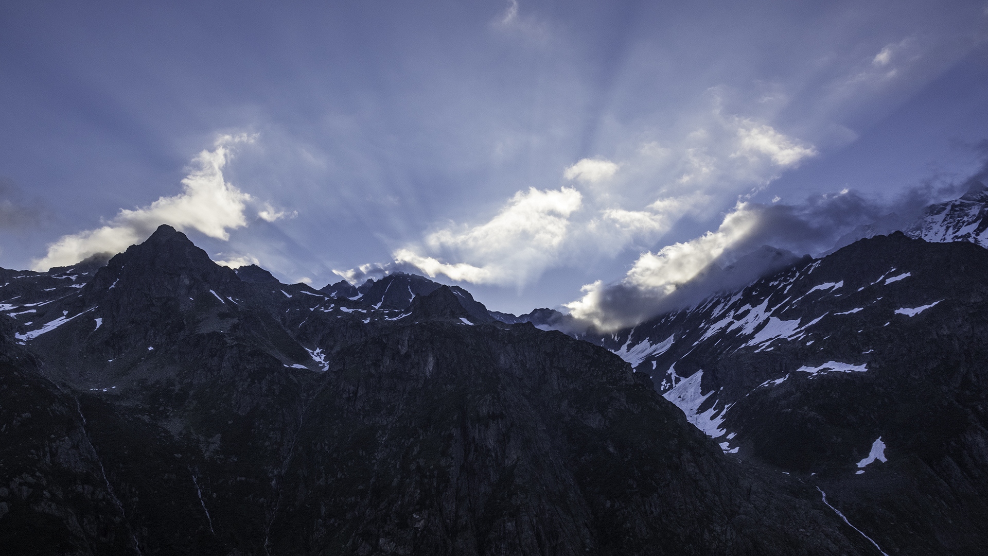 Description: A mountain range with a few clouds in the sky above it and a few snow covered mountains in the background.