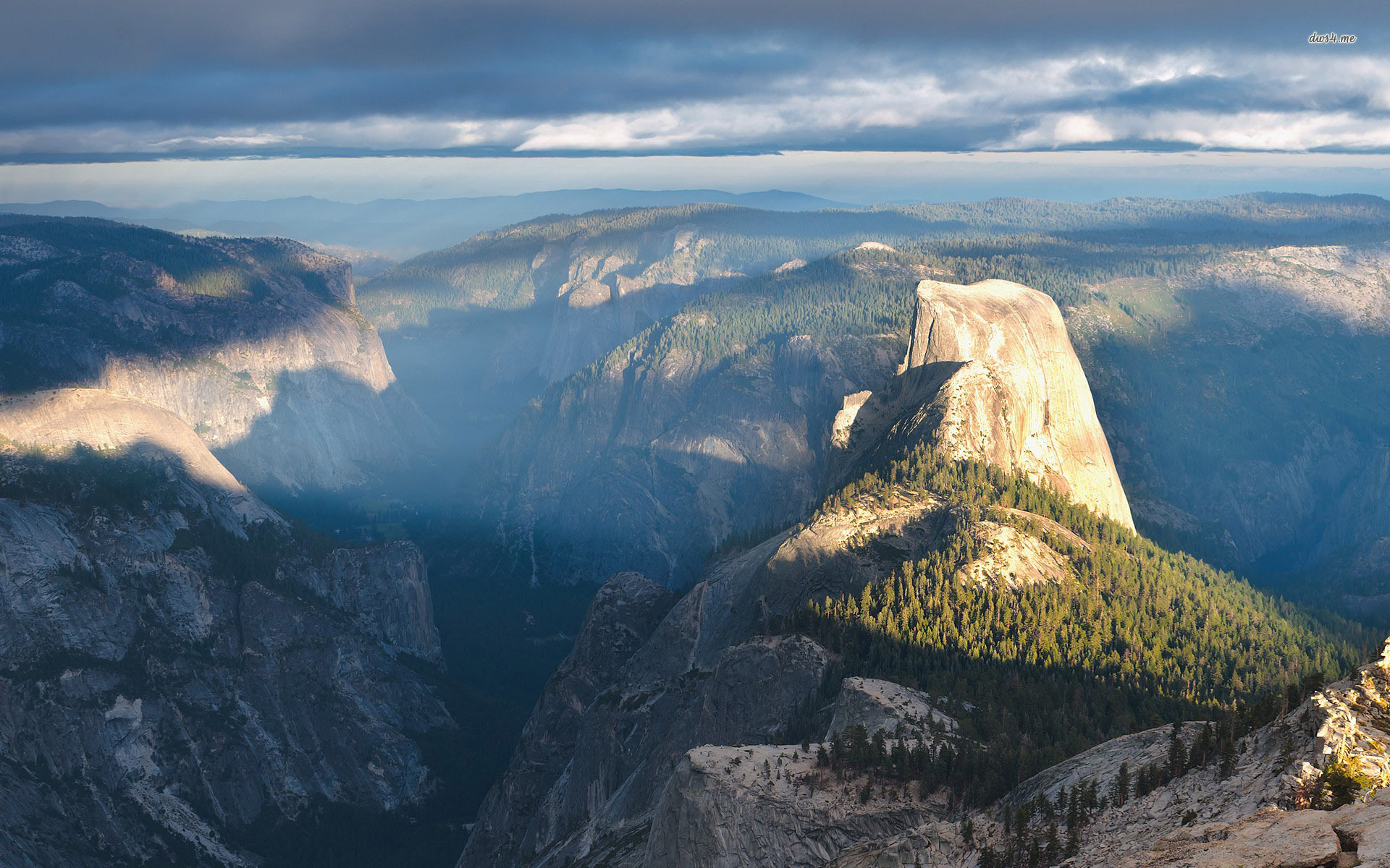 Description: A view of a mountain range with a cloudy sky above it and a forest below it.