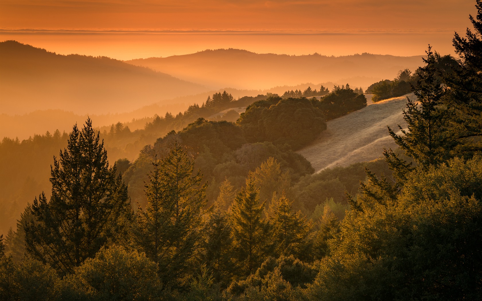 Description: A view of a mountain range with trees and fog in the distance at sunset or dawn with a red sky.