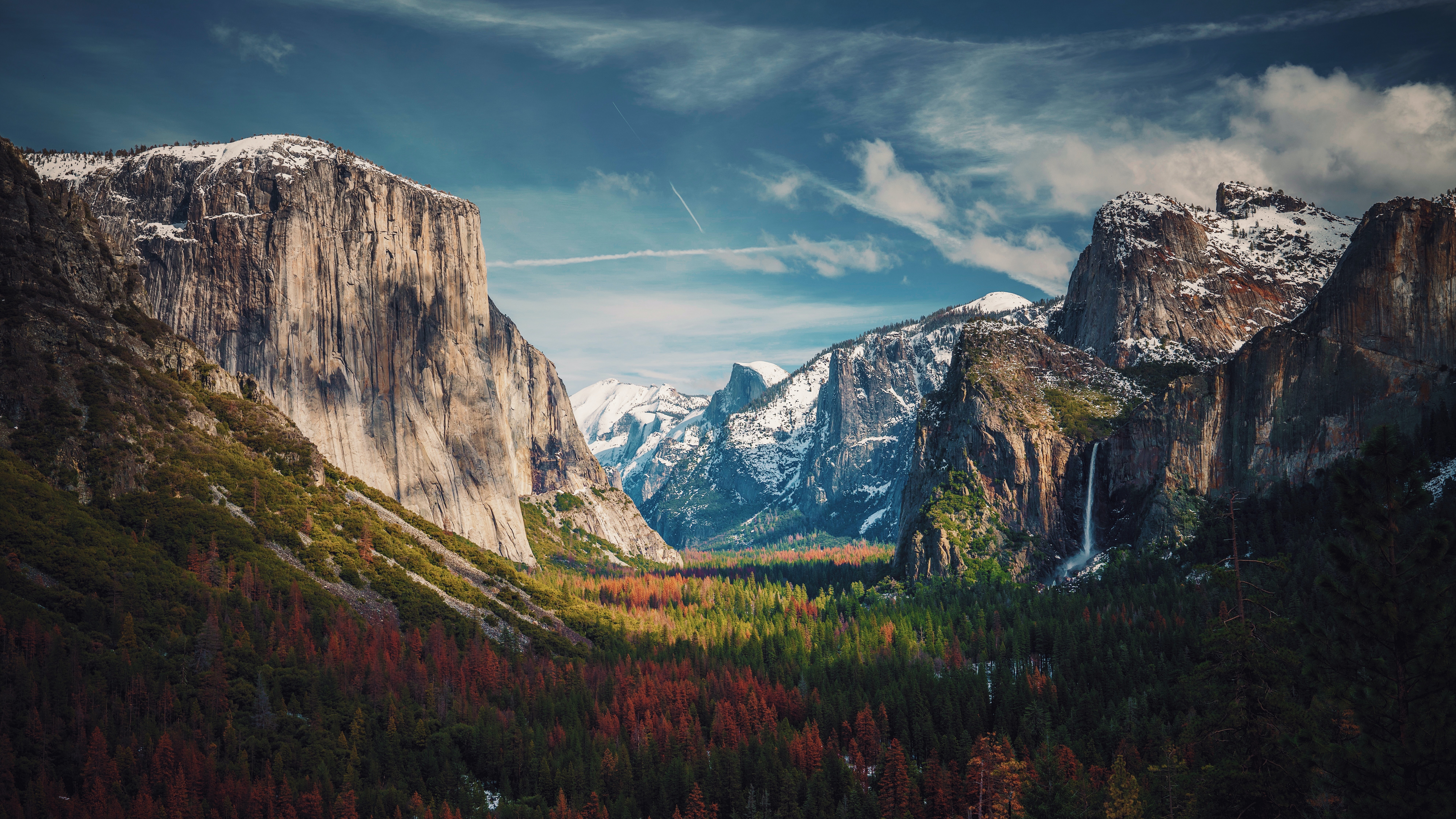 Description: A mountain range with a forest and snow covered mountains in the background with clouds in the sky above it.