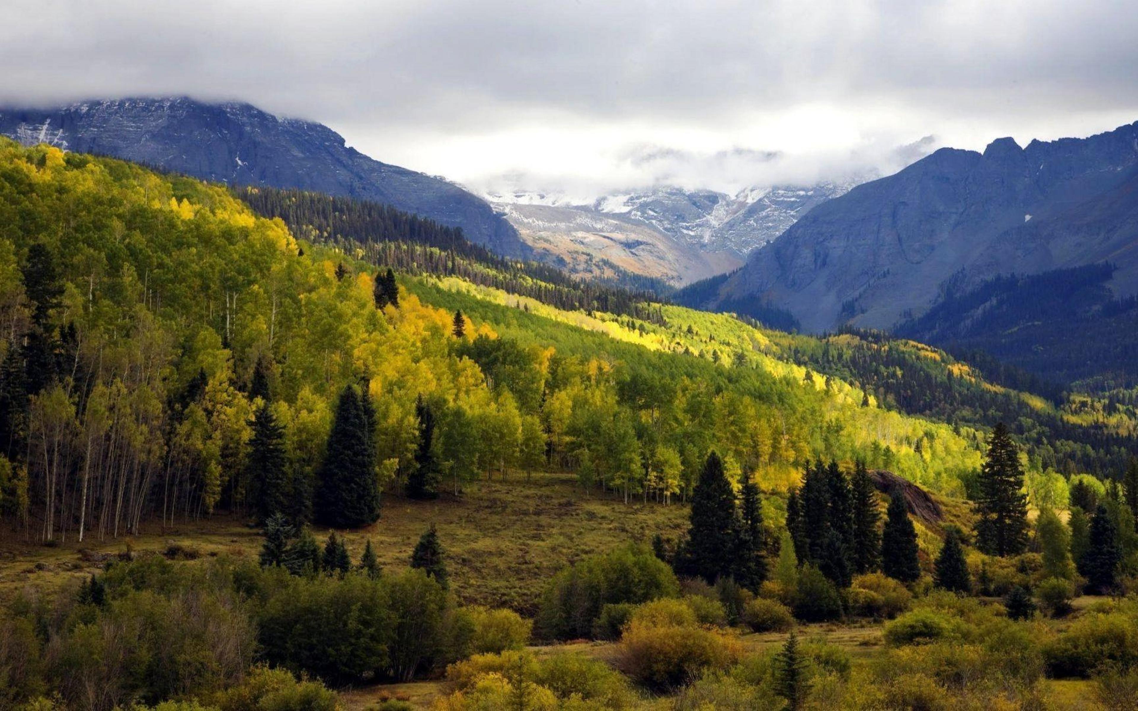 Description: A mountain range with a forest of trees and mountains in the background with snow on the tops of the mountains.
