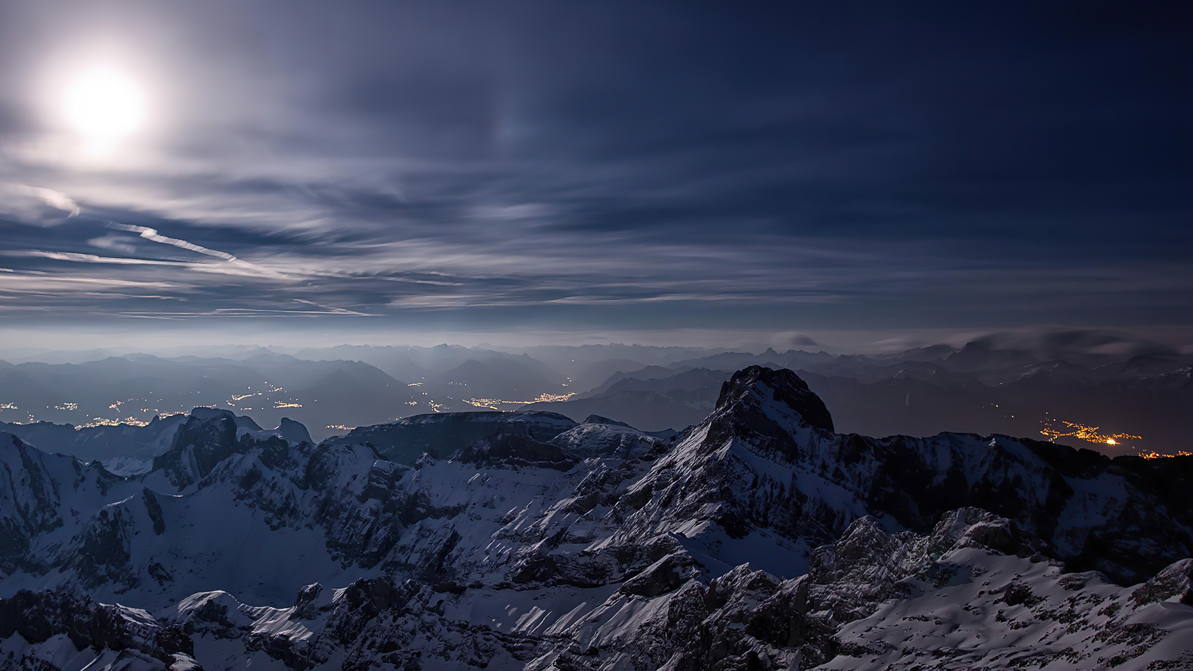 Description: A mountain range with a full moon in the sky above it and a city below it in the distance.