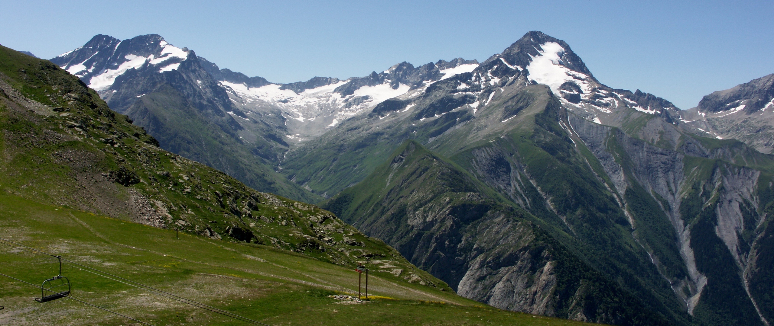 Description: A mountain range with a grassy field below it and a few snow capped mountains in the distance with a blue sky.