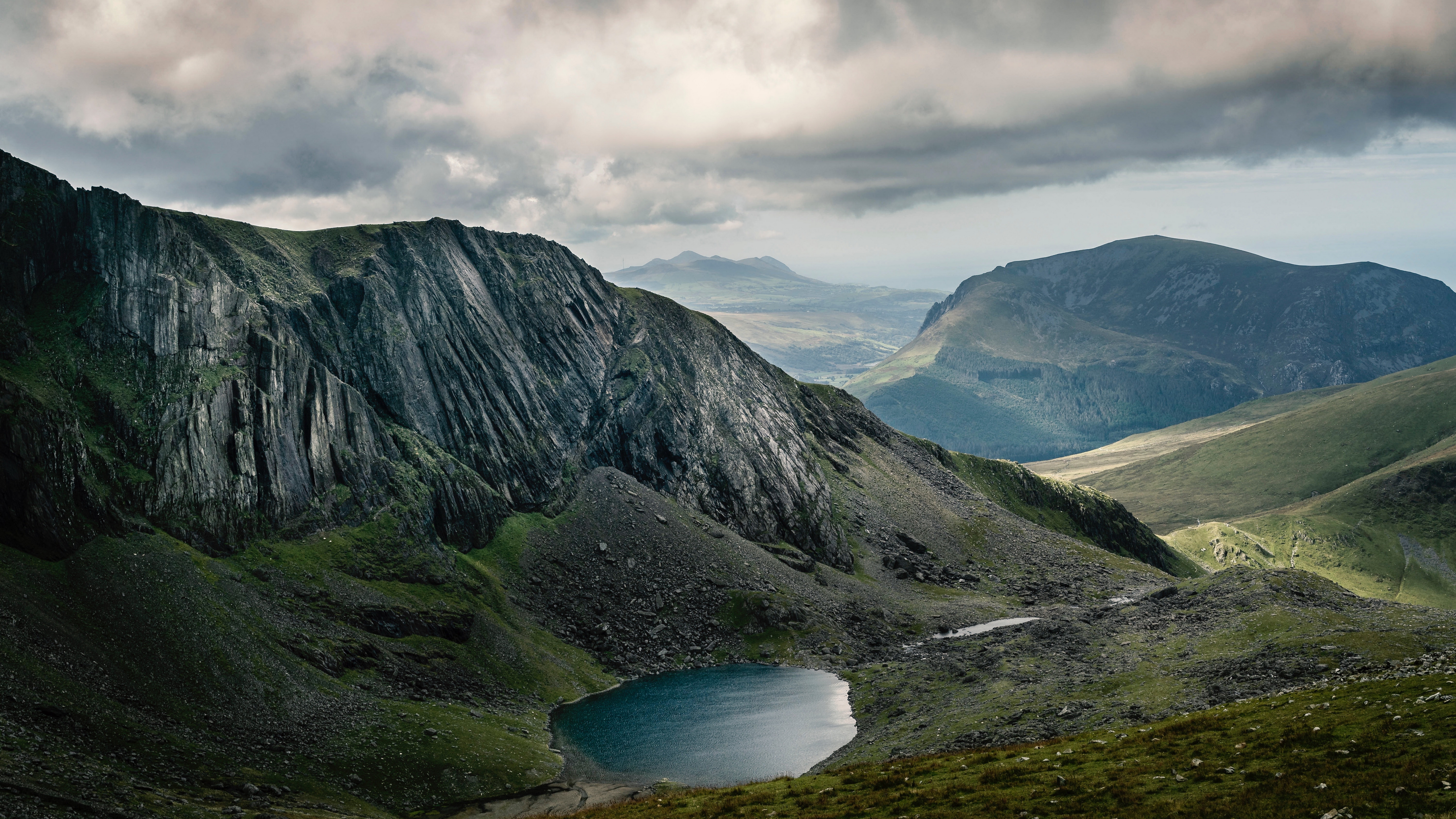 Description: A mountain range with a lake in the middle of it and a cloudy sky above it.