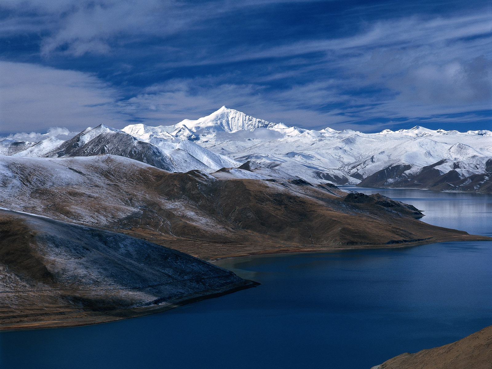 Description: A mountain range with a lake in the foreground and snow covered mountains in the background.