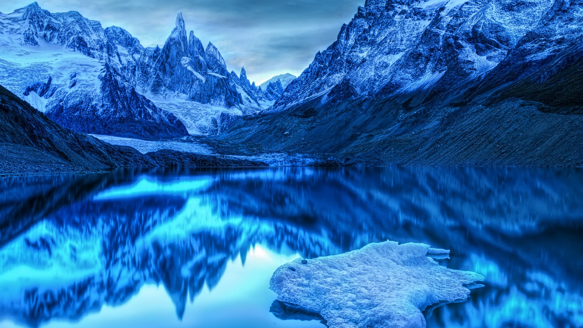 Description: A mountain range with a lake surrounded by snow covered mountains and a cloudy sky above it.
