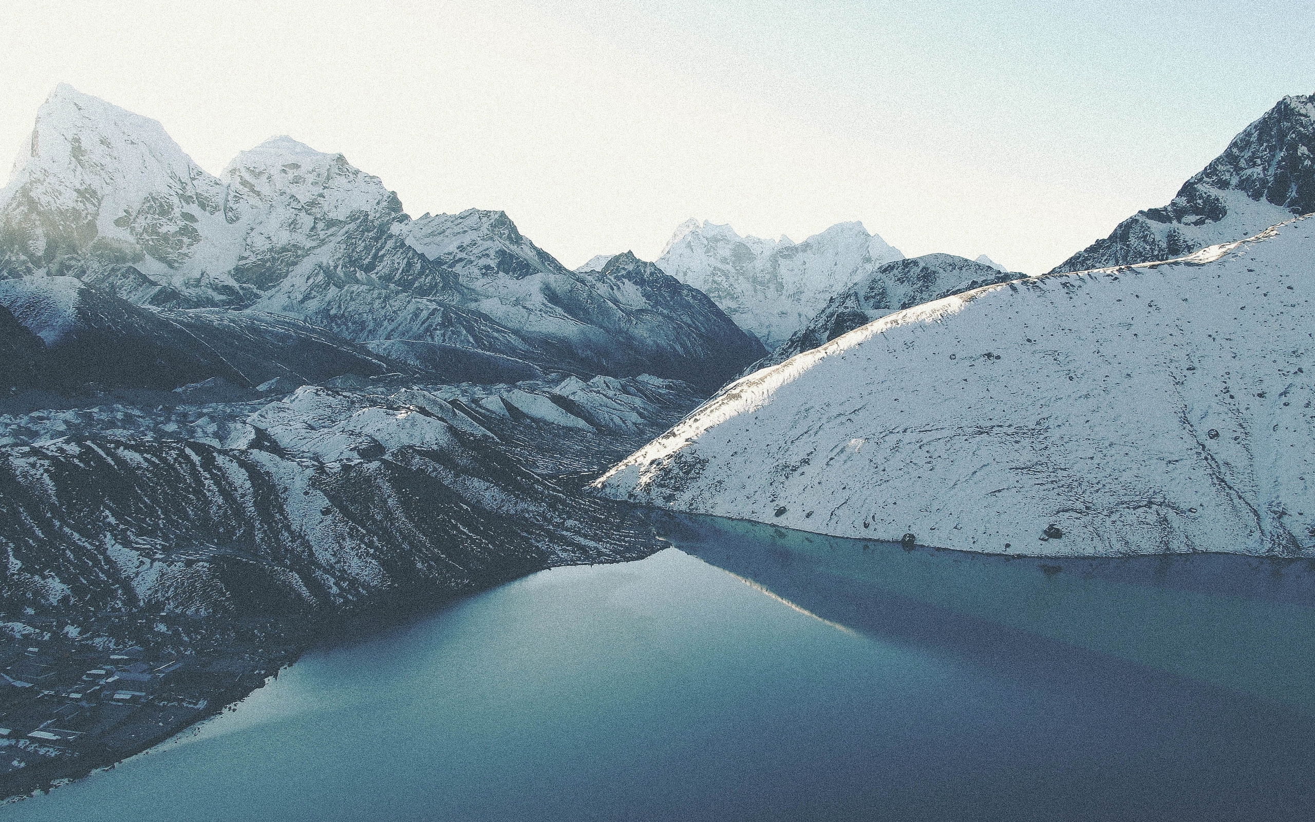 Description: A mountain range with a lake in the middle of it and snow on the mountains around it.