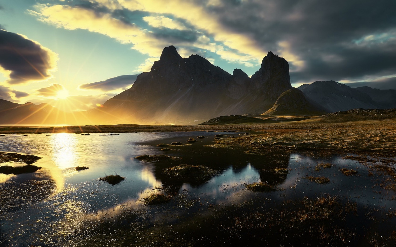 Description: A mountain range with a lake in the foreground and a sunset in the background with clouds in the sky.