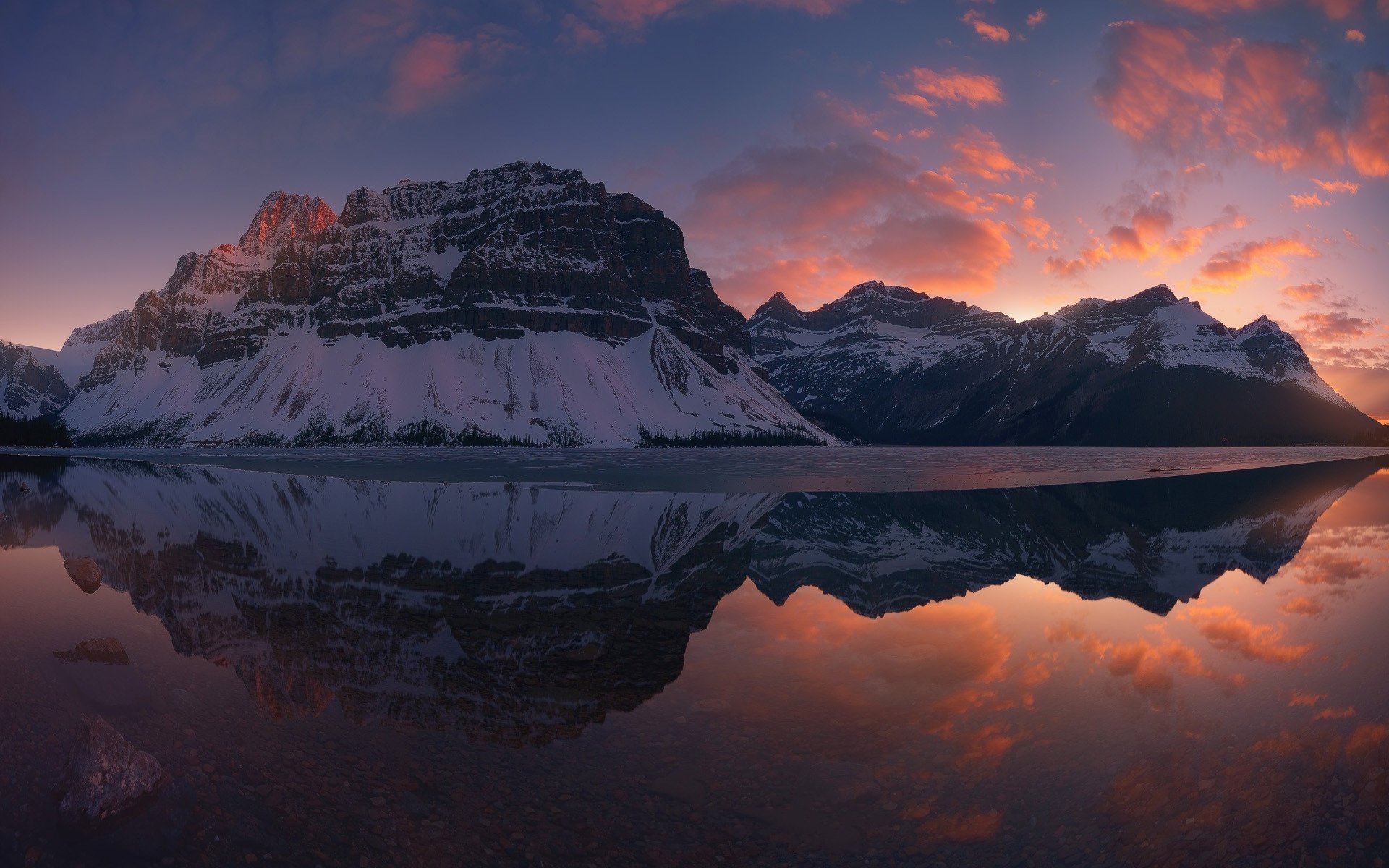 Description: A mountain range with a lake and a sunset in the background with clouds in the sky and a few mountains in the foreground.