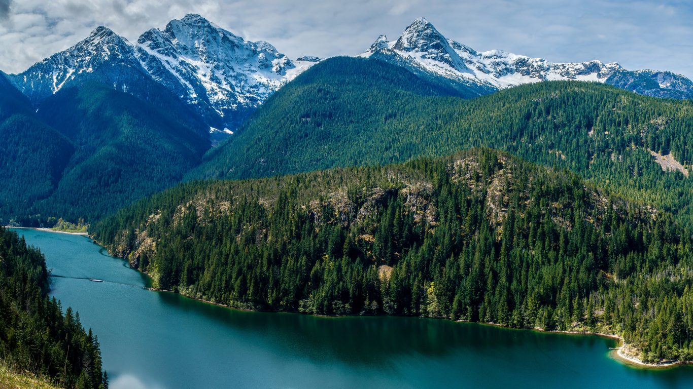 Description: A mountain range with a lake surrounded by trees and snow capped mountains in the background.