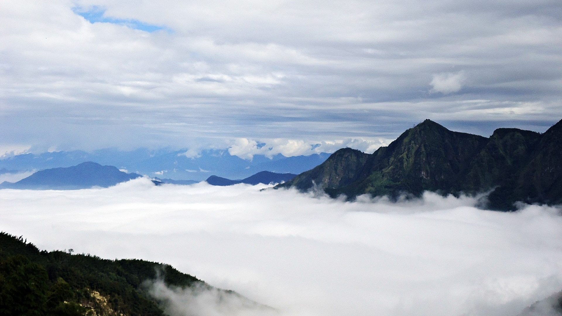 Description: A mountain range with a low lying cloud in the foreground and a few mountains in the background with a few clouds.