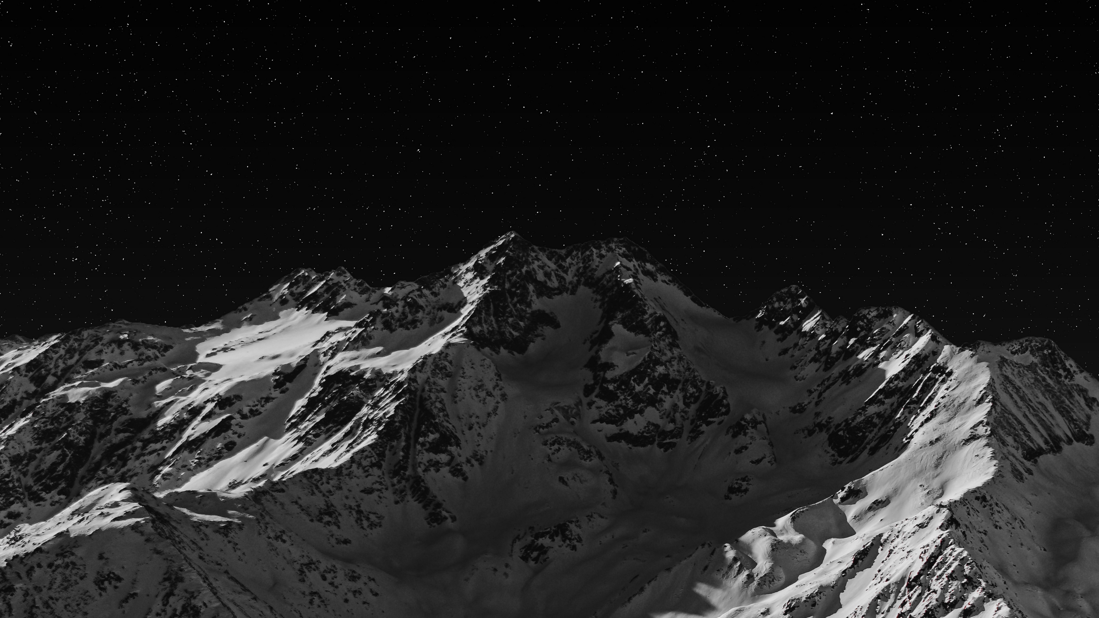Description: A black and white photo of a mountain range at night with stars in the sky above it and a full moon in the sky.
