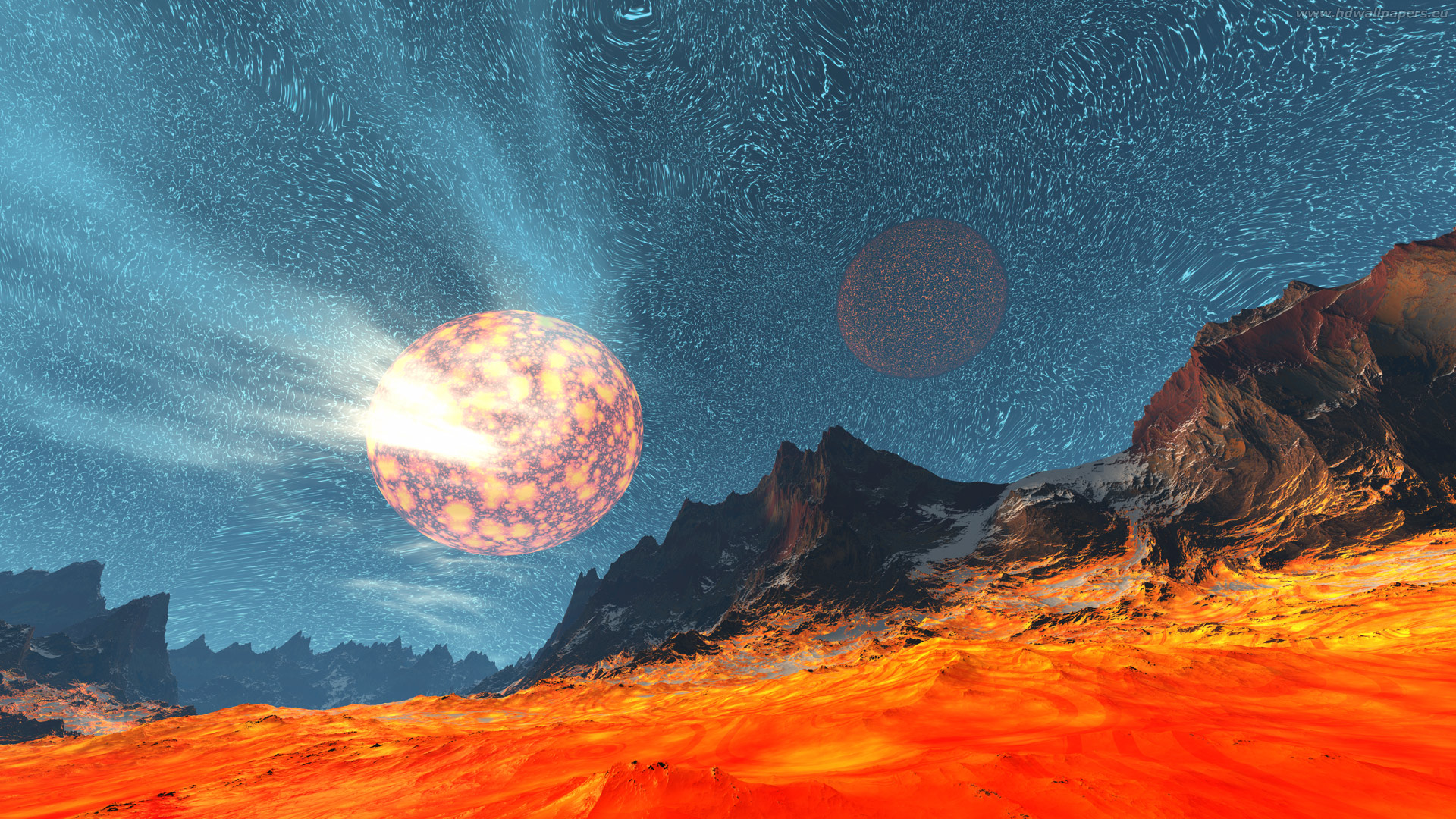 Description: A computer generated image of a mountain range with a bright orange substance in the foreground and a blue sky with clouds.