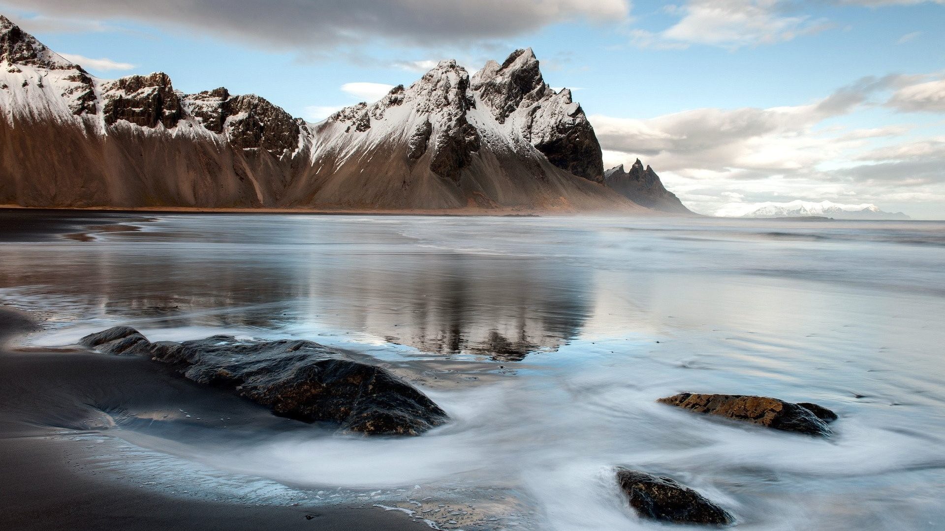 Description: A mountain range is reflected in the water of a lake with rocks and ice on the shore and a few waves.