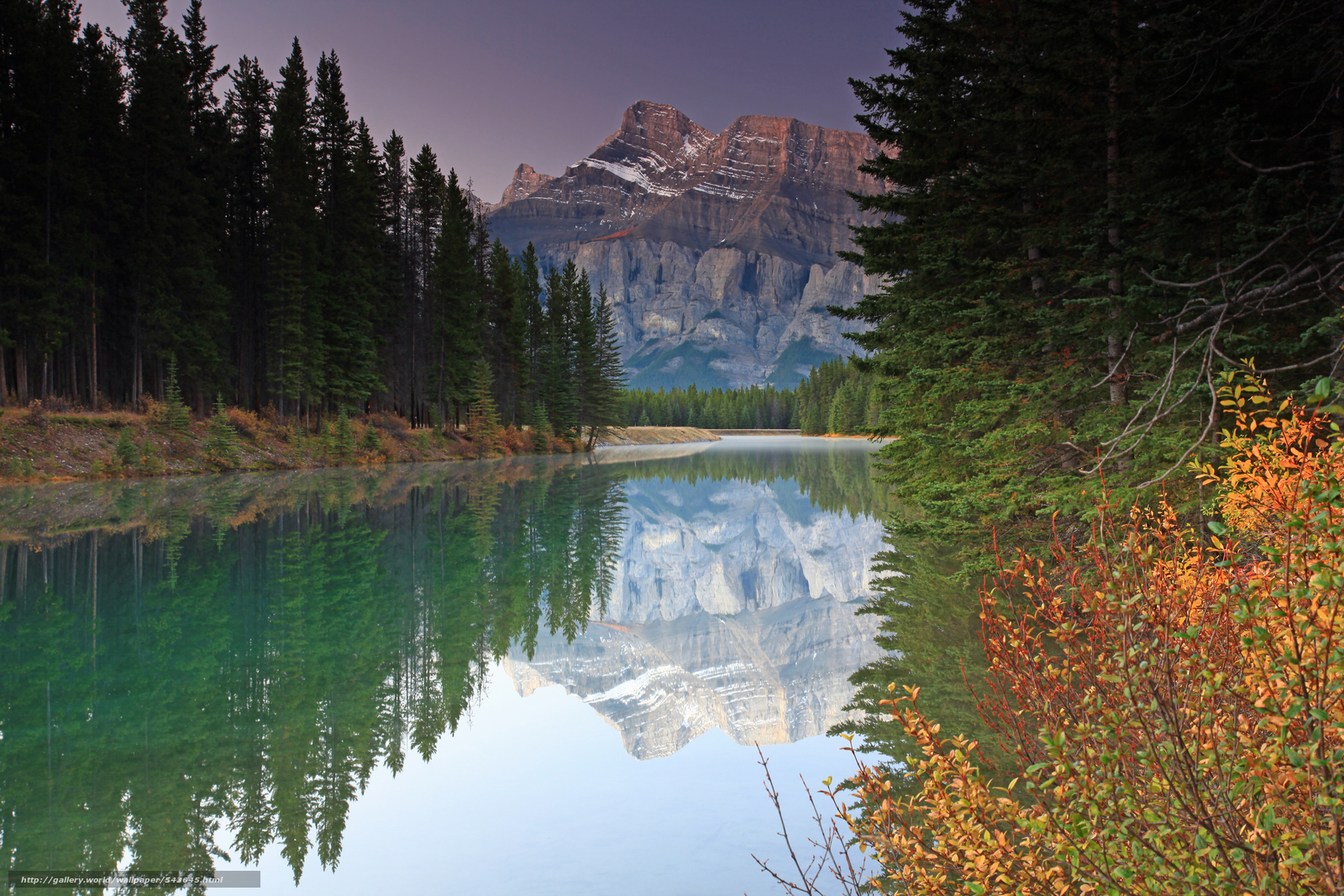 Description: A mountain range is reflected in a lake surrounded by trees and bushes with a mountain in the background and a forest in the foreground.