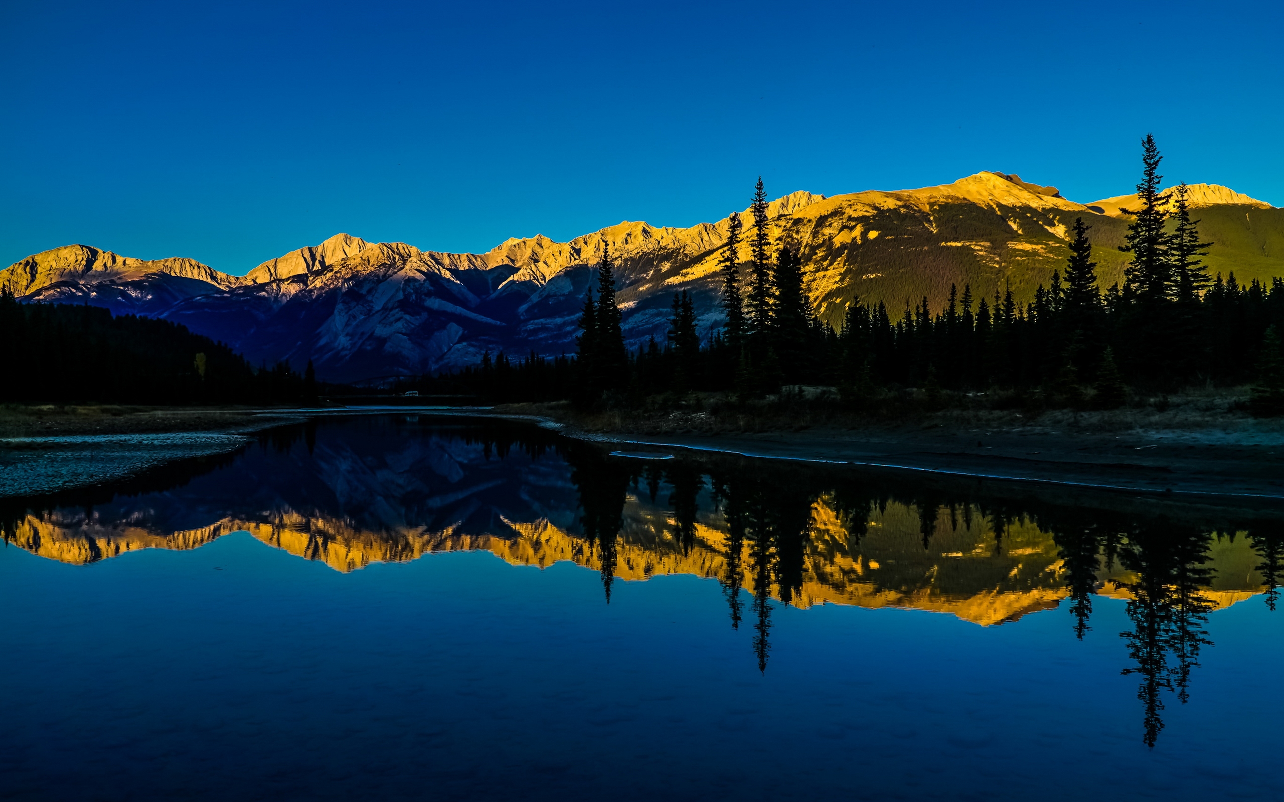 Description: A mountain range is reflected in a still lake at sunset with a forest in the foreground and a blue sky.
