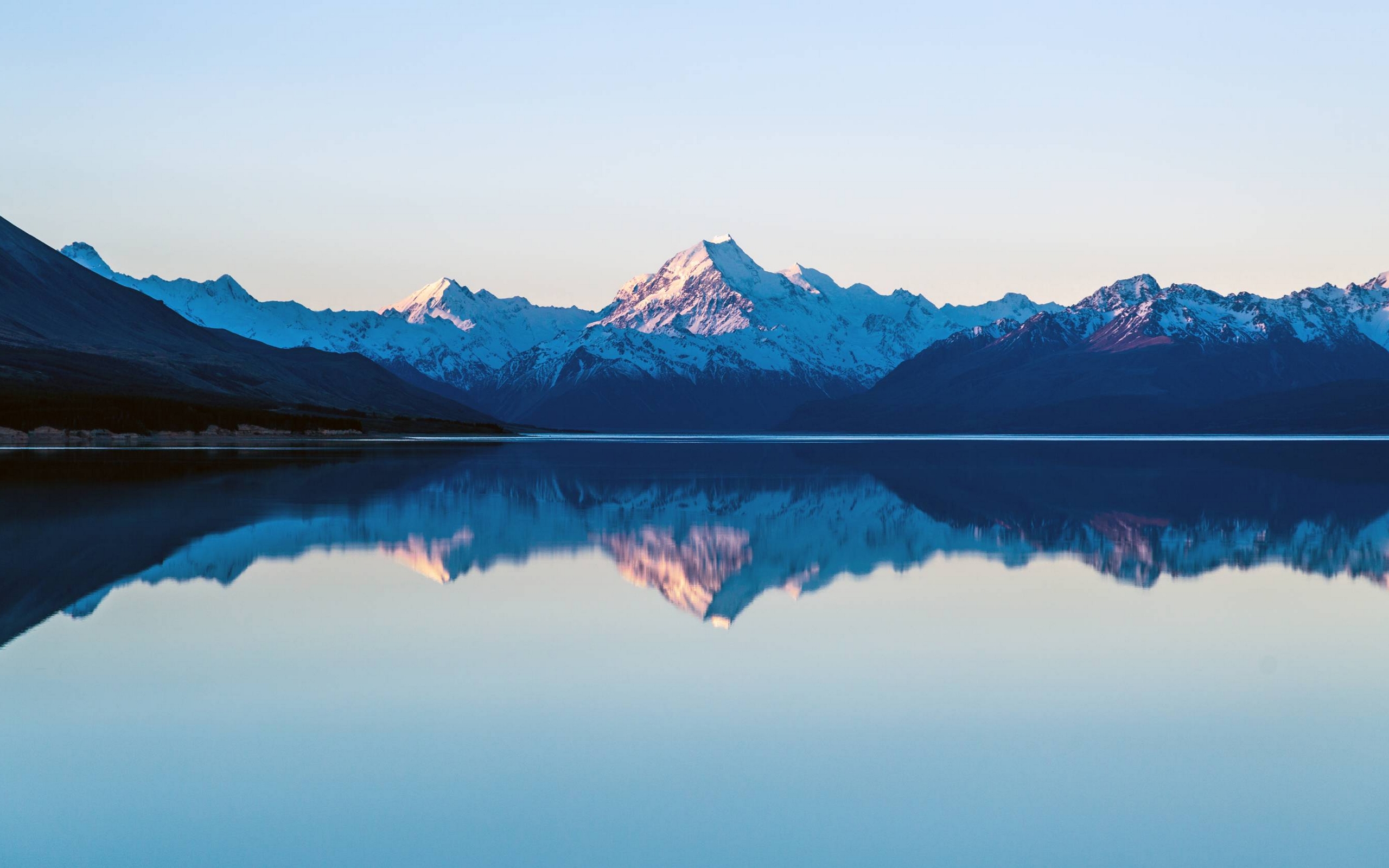 Description: A mountain range is reflected in a still lake at sunset or dawn with a clear sky and a blue sky.