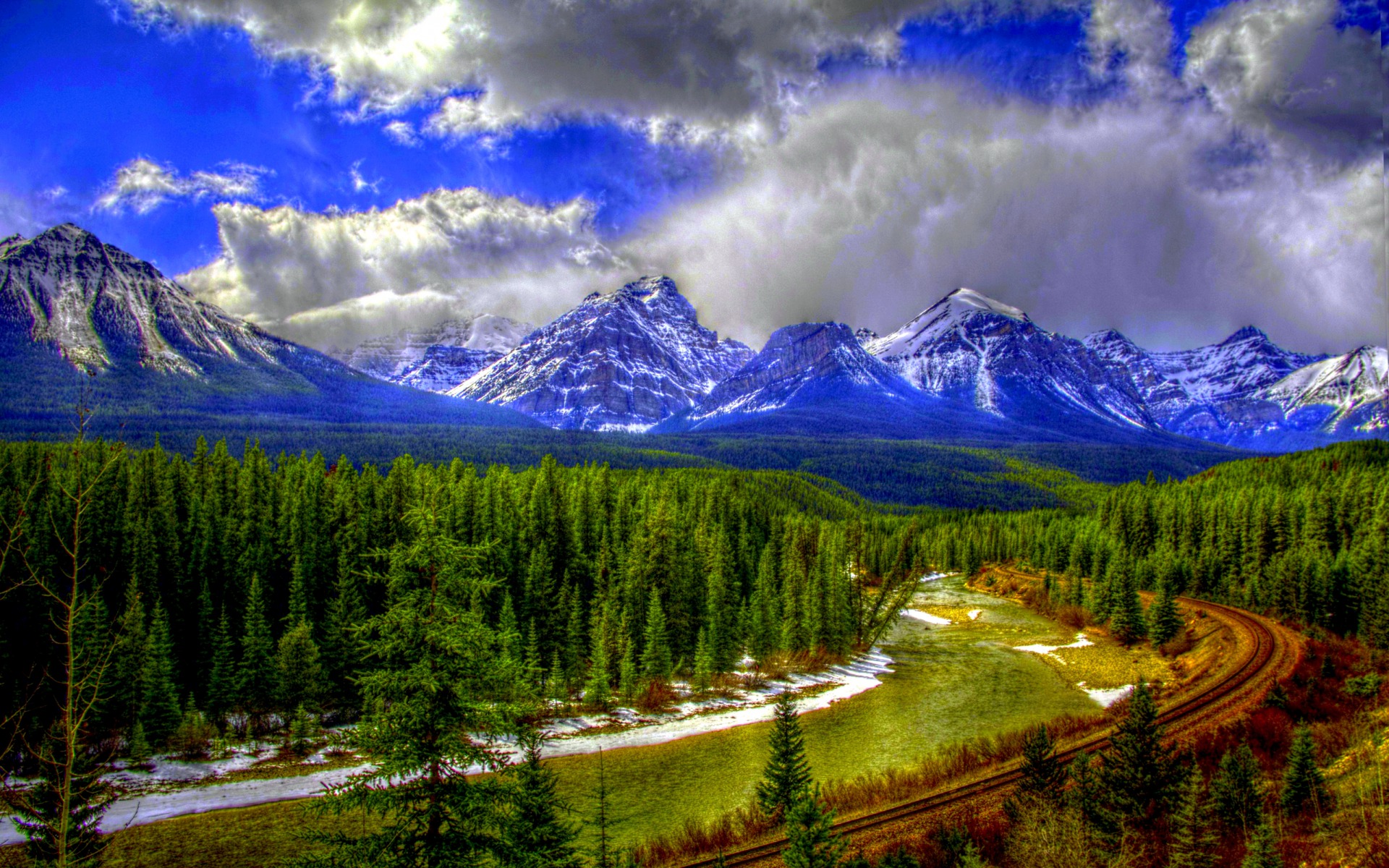 Description: A scenic view of a mountain range with a river running through it and snow capped mountains in the distance.