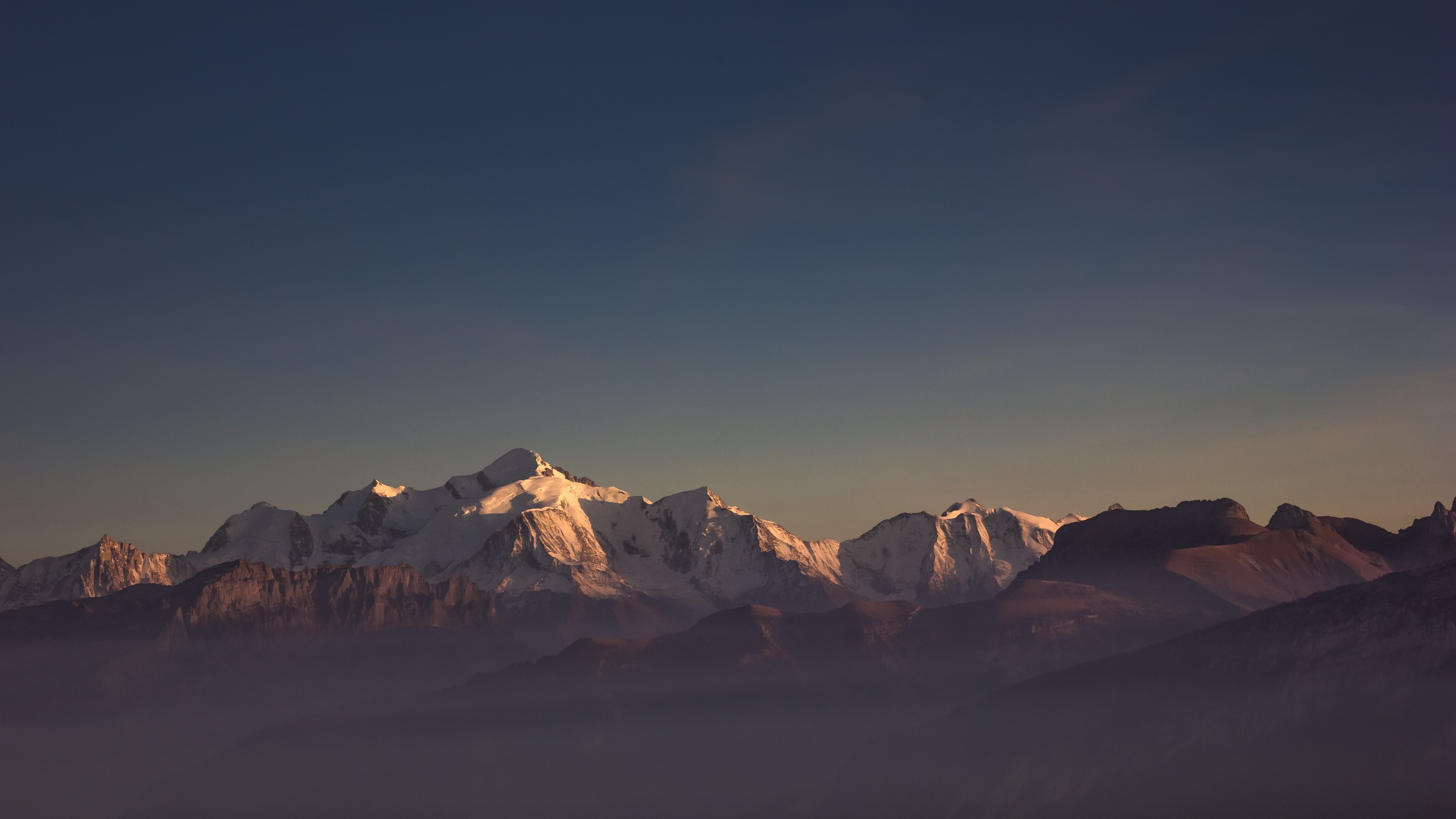 Description: A mountain range with a few snow capped mountains in the distance with a blue sky above it and a few clouds below.