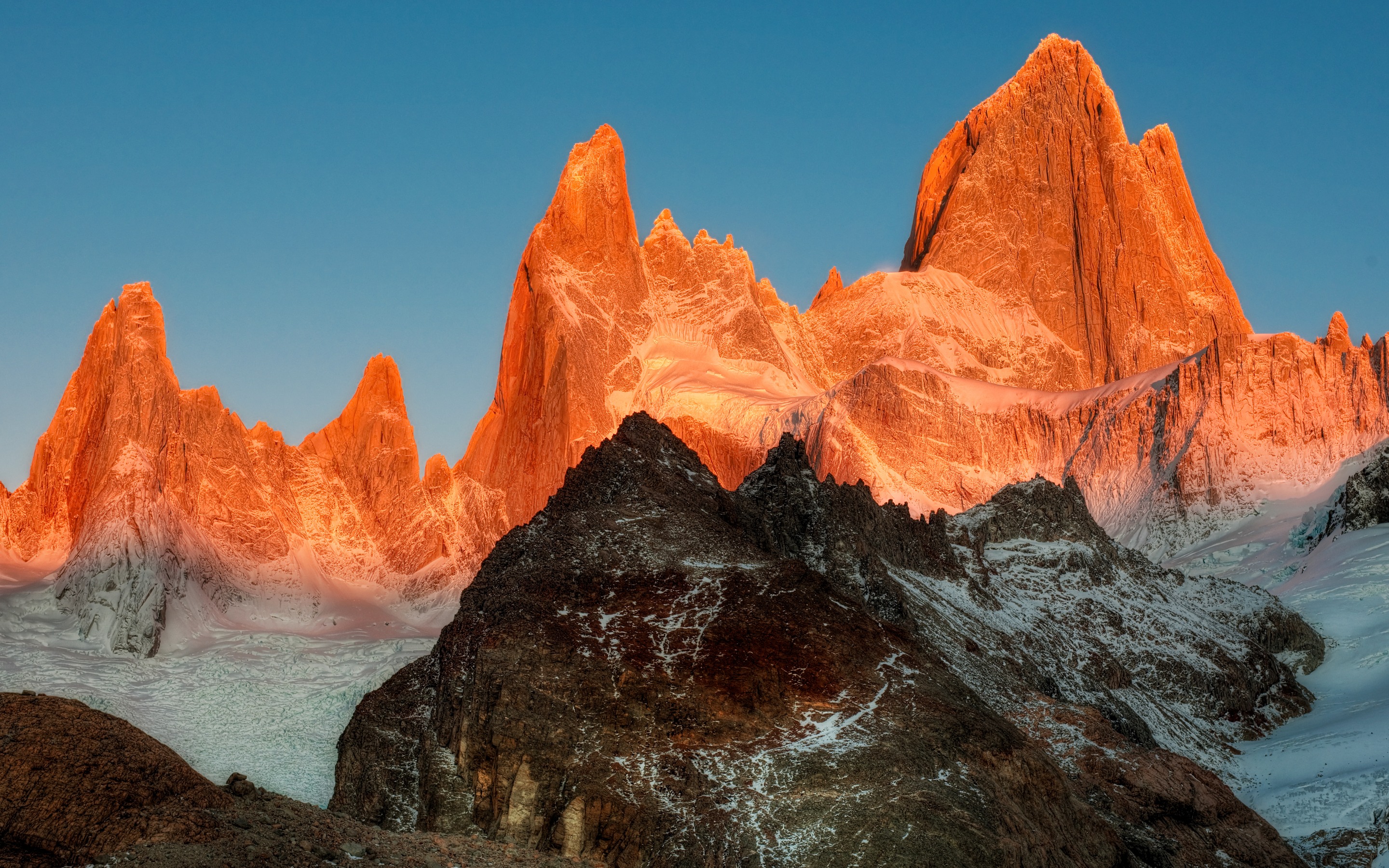 Description: A mountain range with a few snow covered mountains in the background at sunset or dawn with a blue sky.
