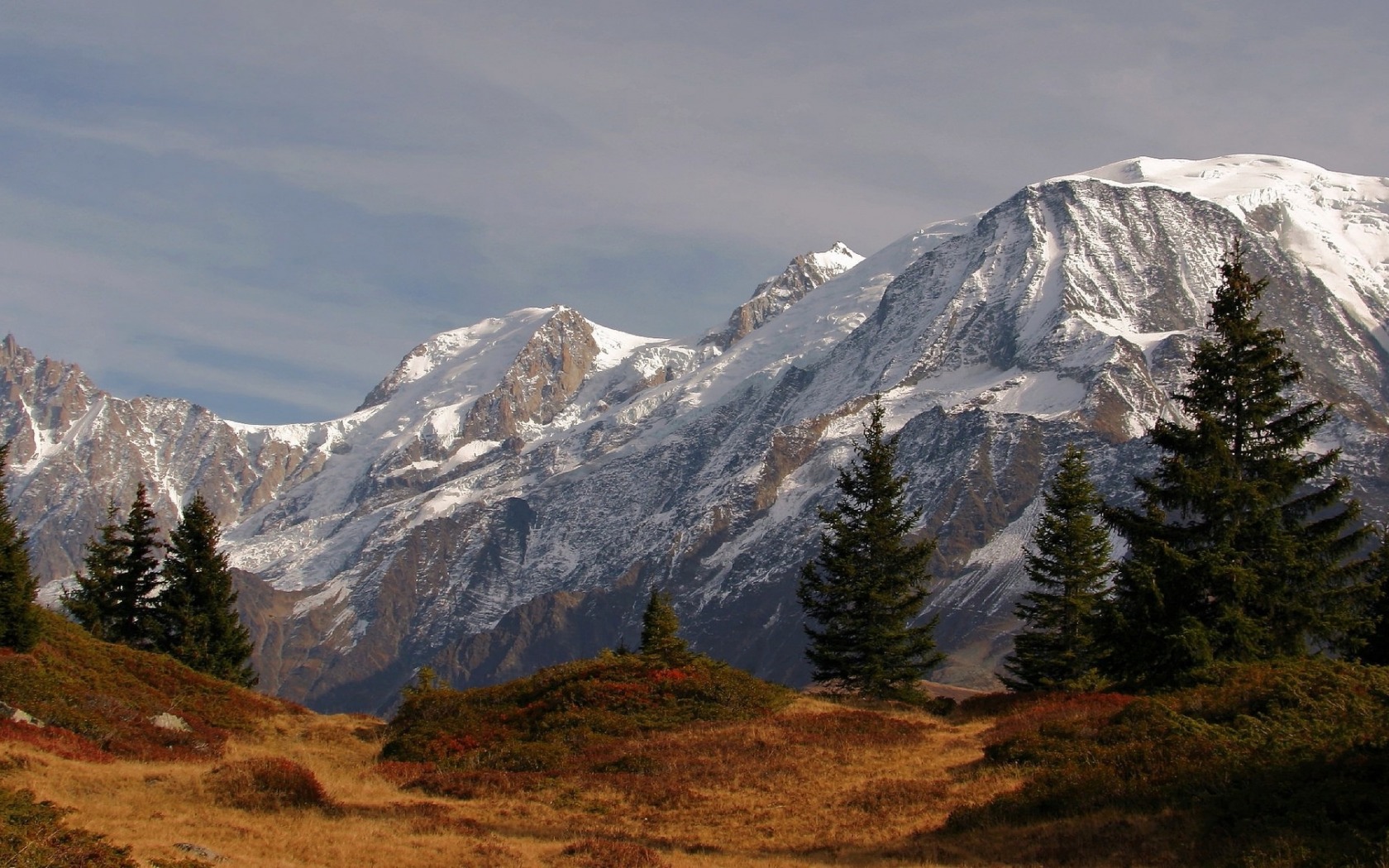 Description: A mountain range with snow on the top and trees on the bottom of it.