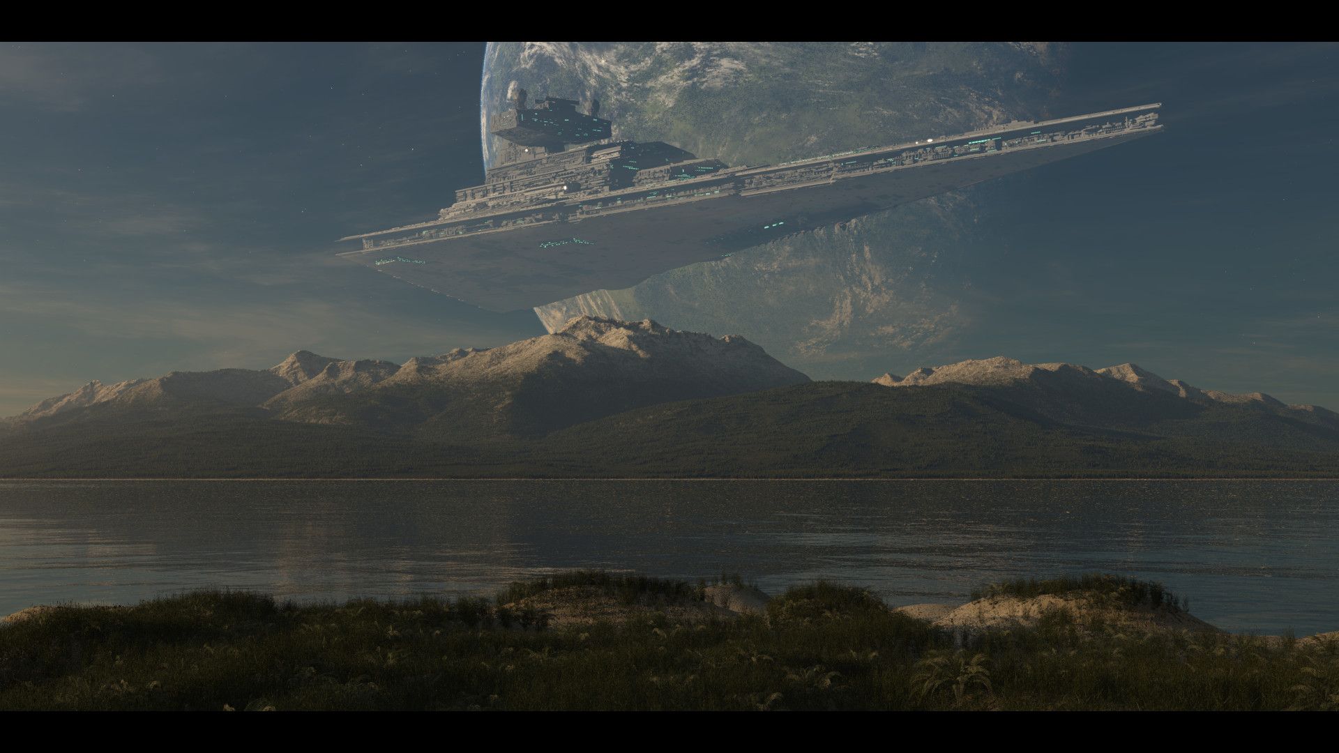 Description: A computer generated image of a mountain range and a space station in the distance with a mountain range in the foreground.