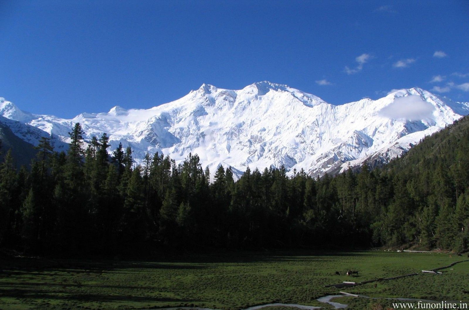 Description: A mountain range with a stream running through it and trees in the foreground and a blue sky with clouds.