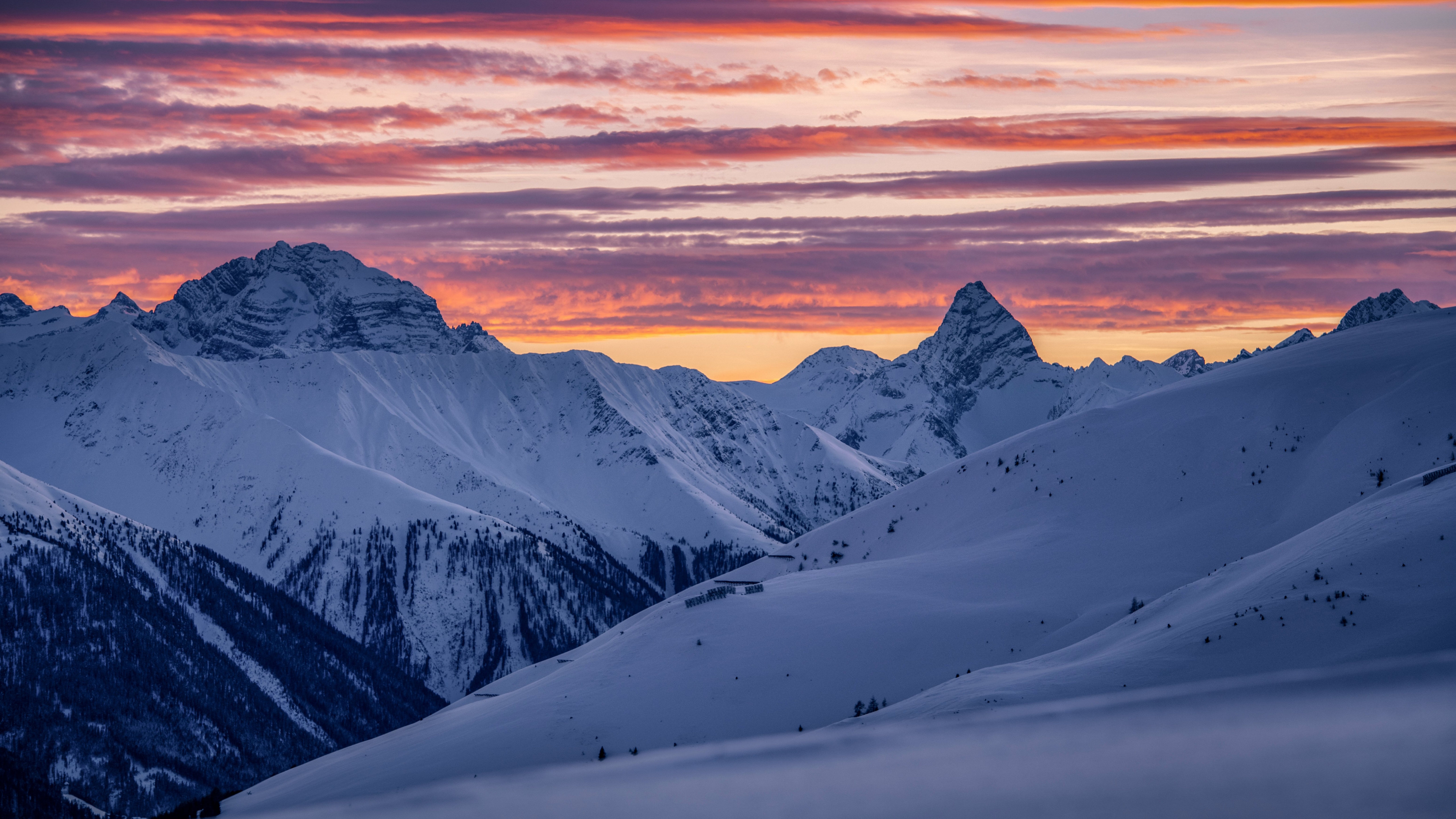 Description: A mountain range with a sunset in the background and a pink sky in the foreground with clouds in the sky.