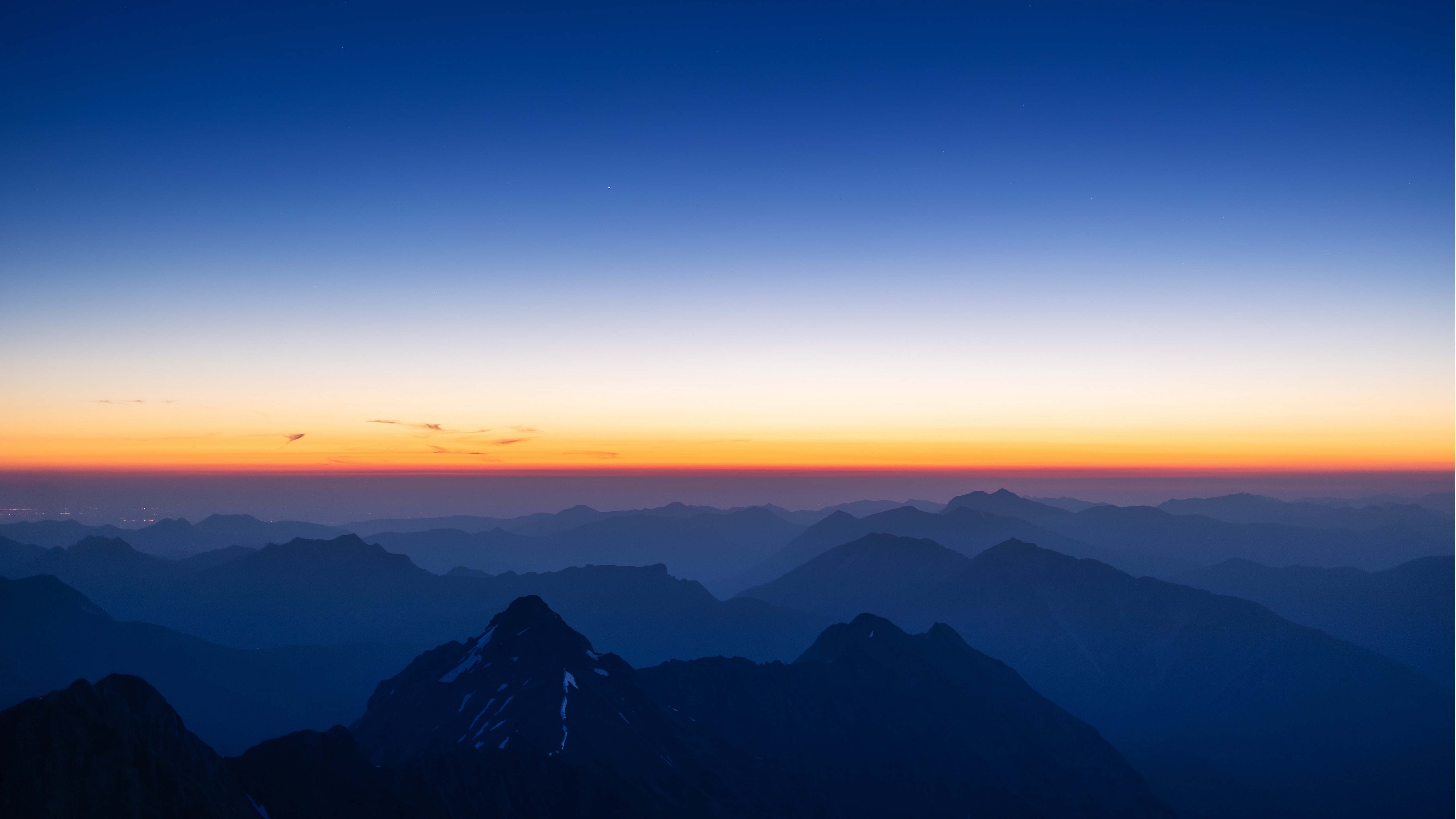 Description: A view of a mountain range at sunset from a plane window with the sun setting in the distance and the mountains in the foreground.