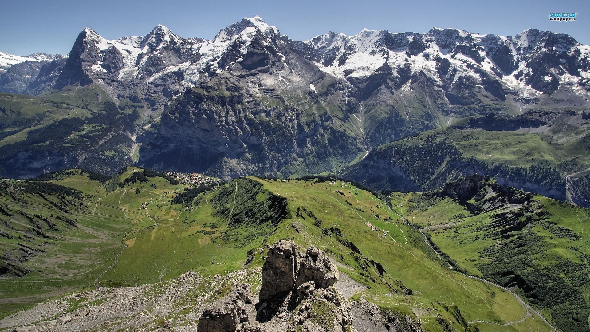 Description: A view of a mountain range with a valley below it and snow capped mountains in the distance with a blue sky.