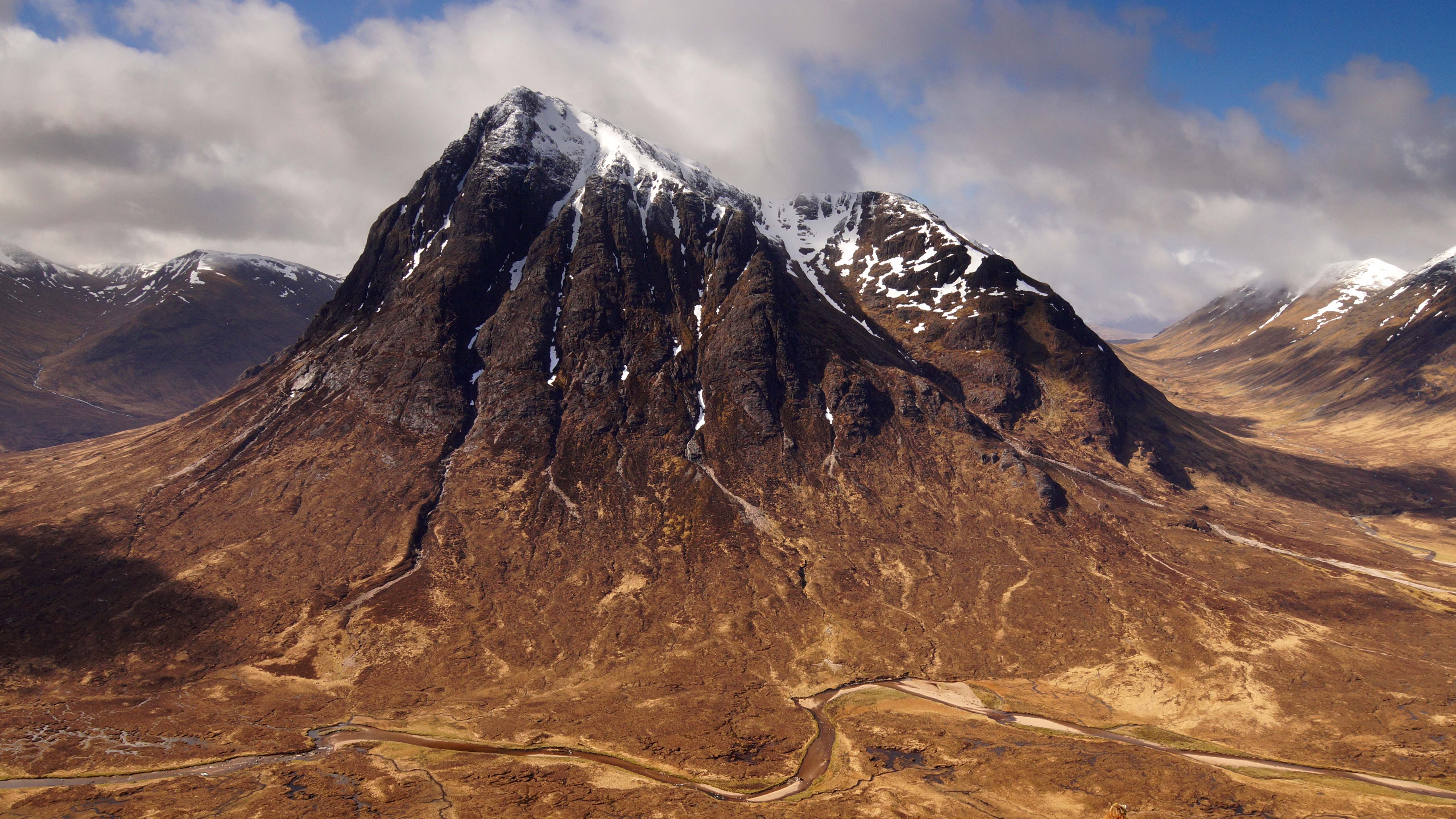 Description: A mountain range with a winding road in the foreground and a cloudy sky above it.
