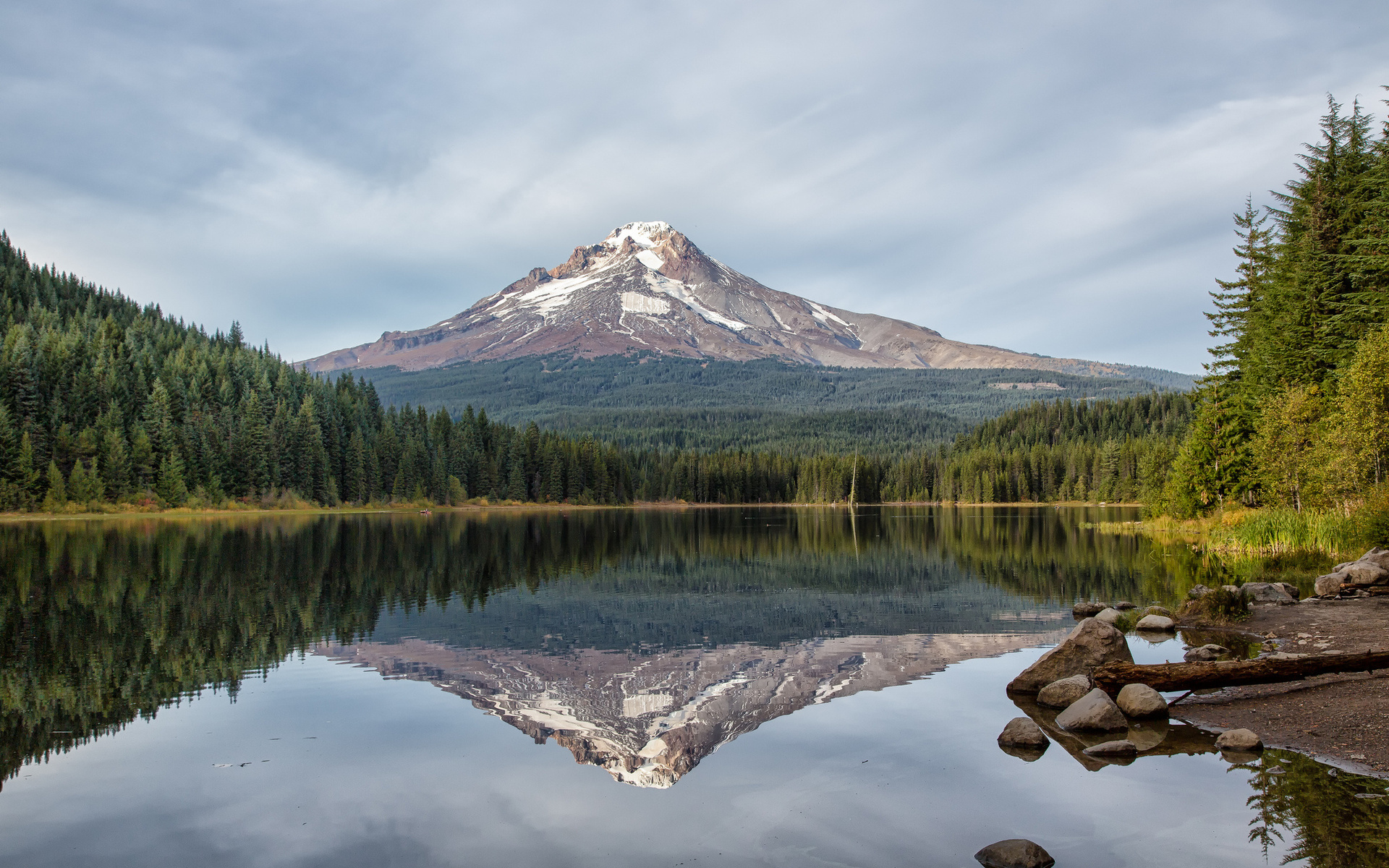 Description: A mountain is reflected in a still lake with rocks and trees around it and a cloudy sky is in the background.