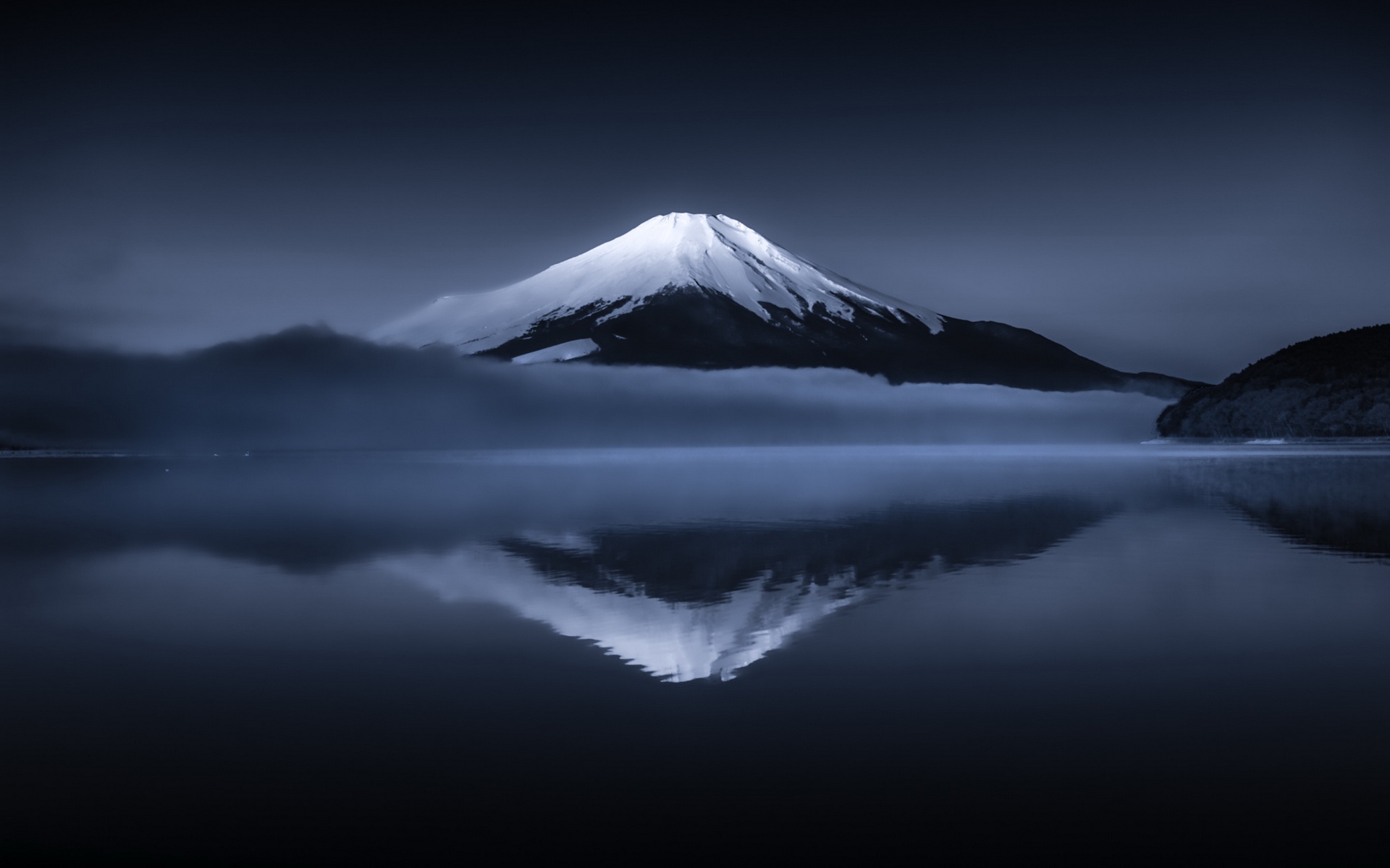Description: A mountain with a snow capped peak in the distance is reflected in a still lake at night time with fog.