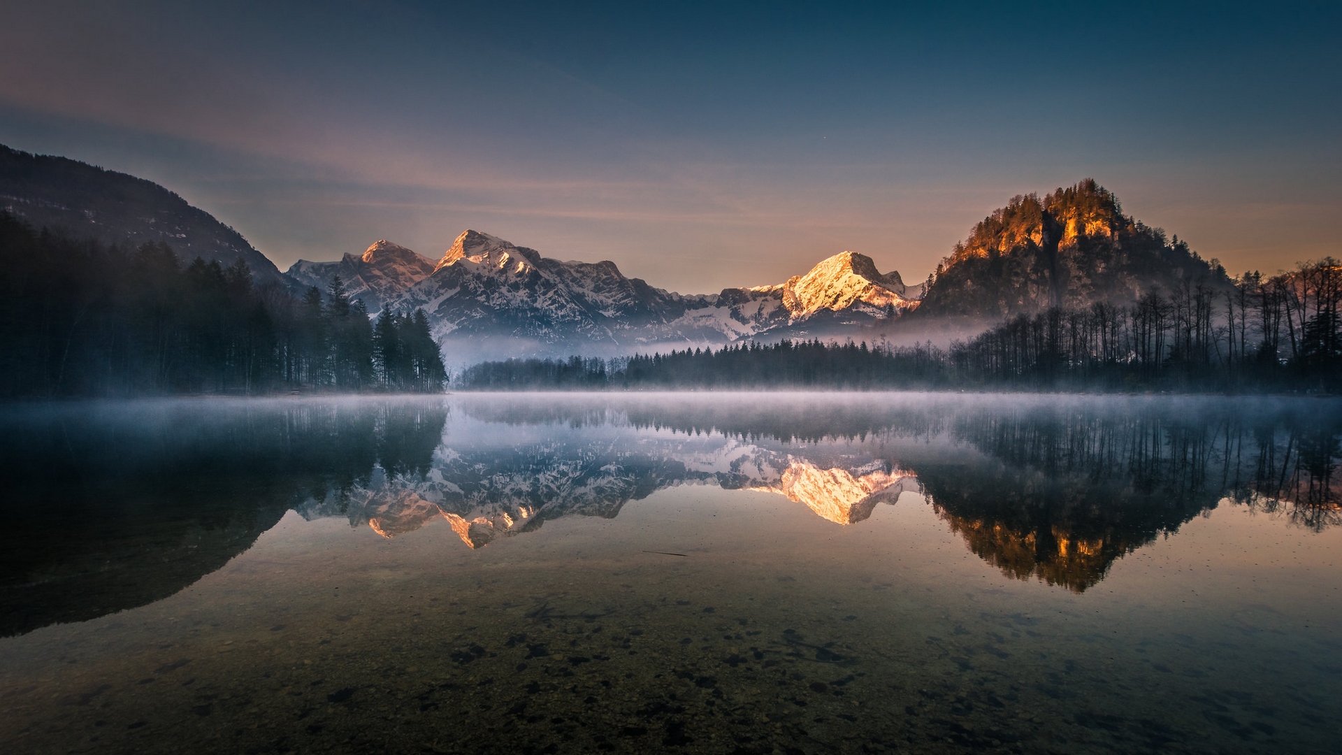Description: A mountain range is reflected in a lake at sunset with a foggy sky and trees in the foreground.