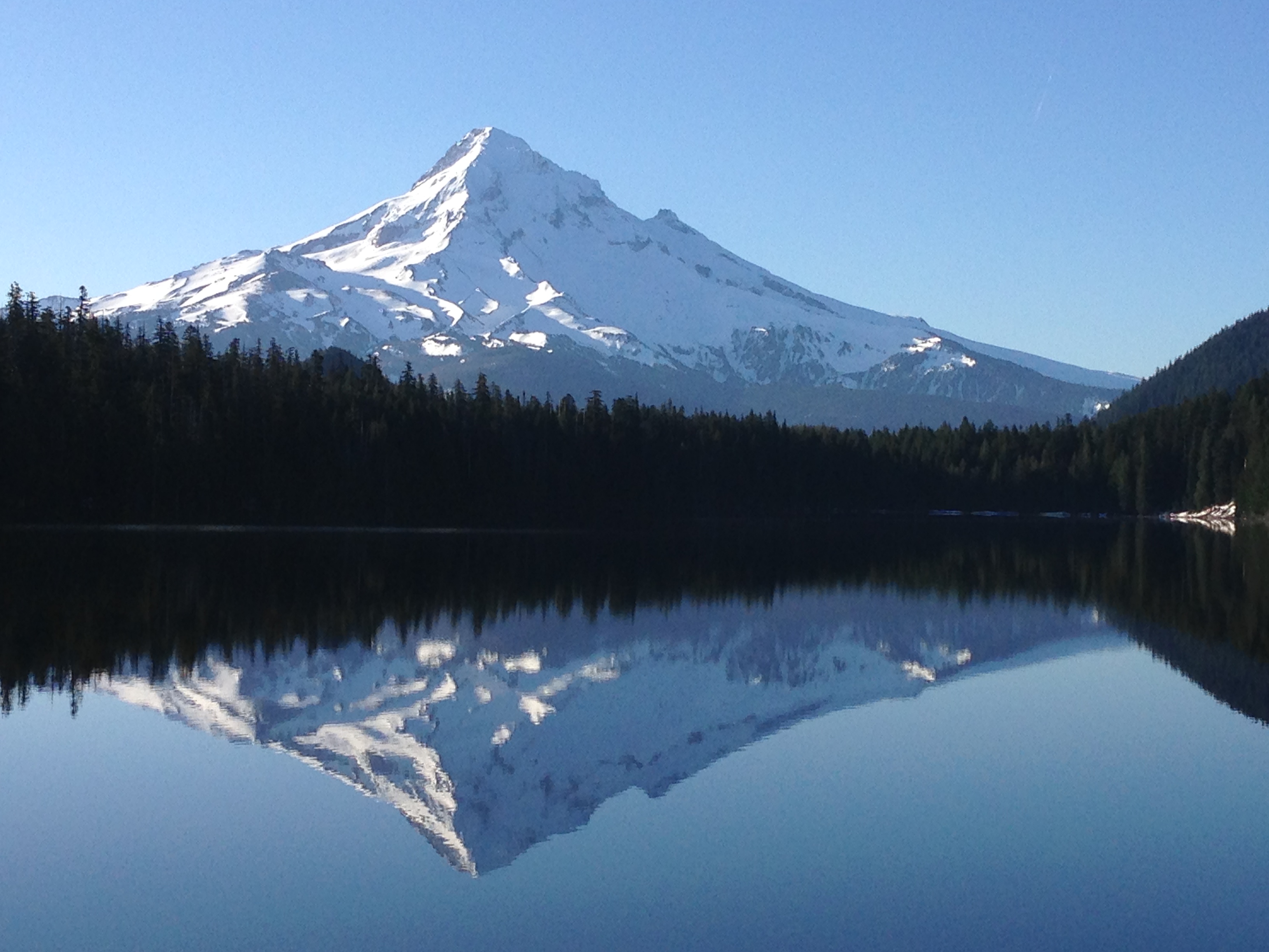Description: A mountain is reflected in a still lake with trees around it and a clear blue sky above it.