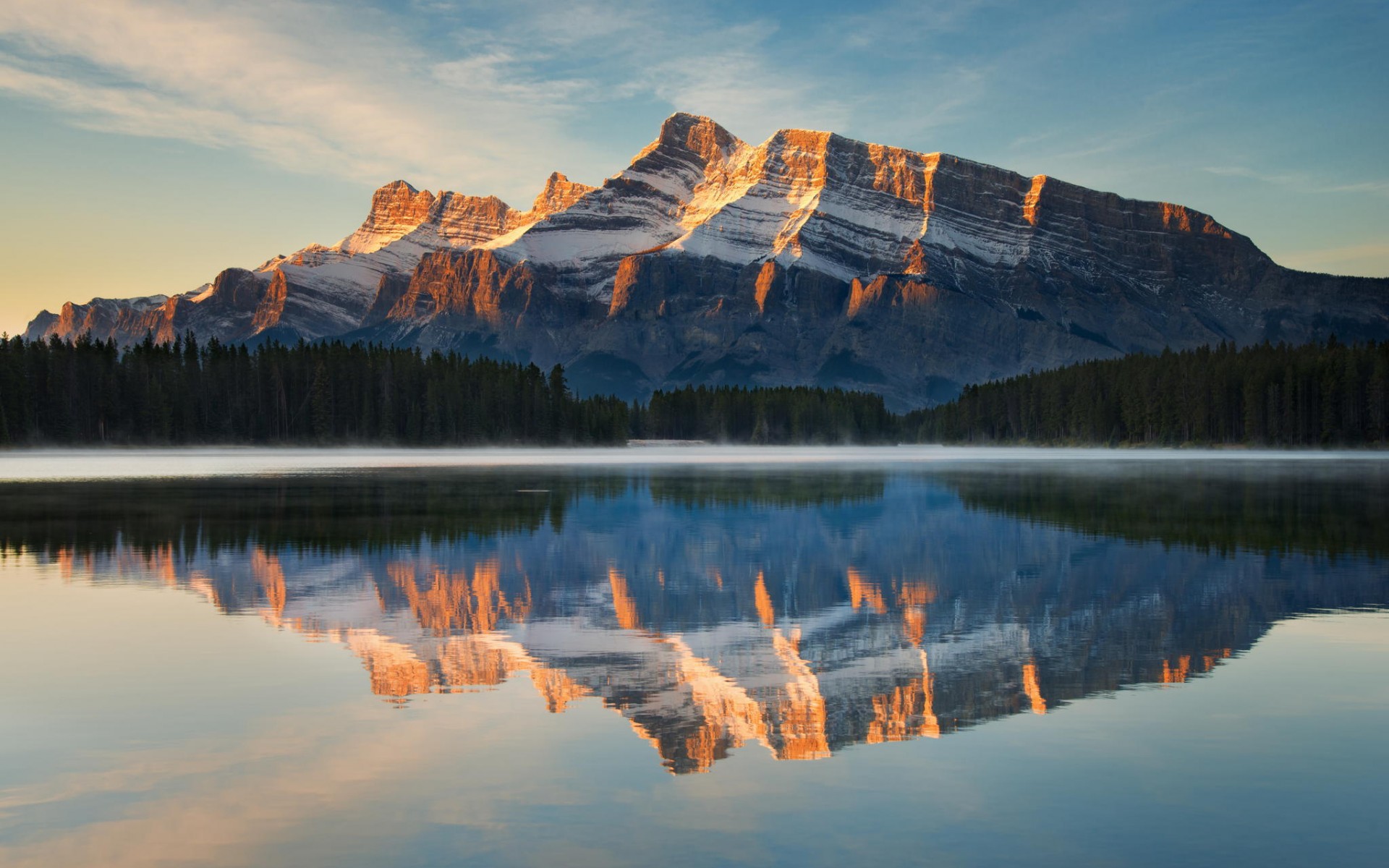 Description: A mountain range is reflected in a lake at sunset with a few clouds in the sky and a few trees in the foreground.