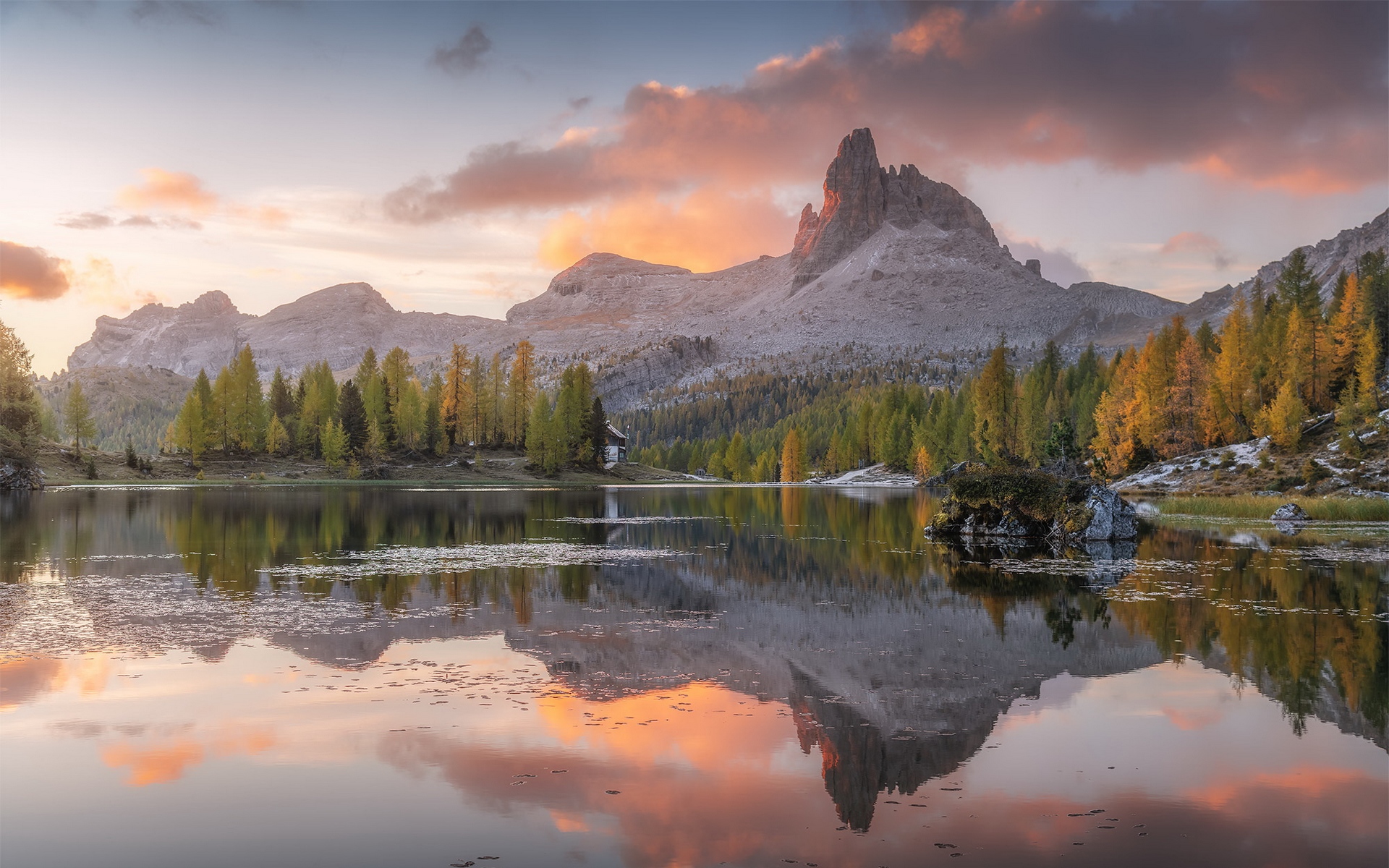 Description: A mountain range is reflected in a lake at sunset with a pink sky and clouds in the background and a few trees in the foreground.