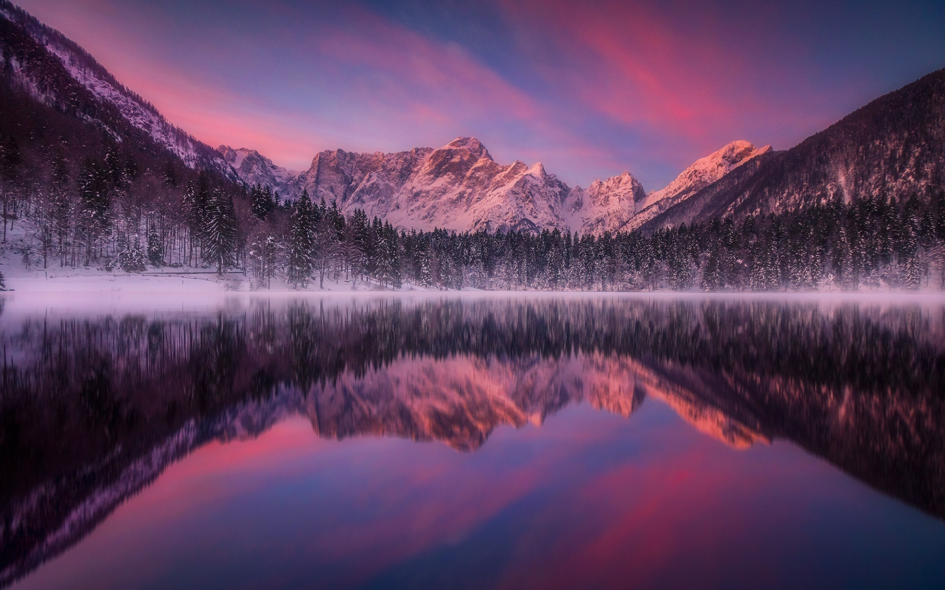 Description: A mountain range is reflected in a lake at sunset with a pink sky and clouds in the background and a pink and purple sky.