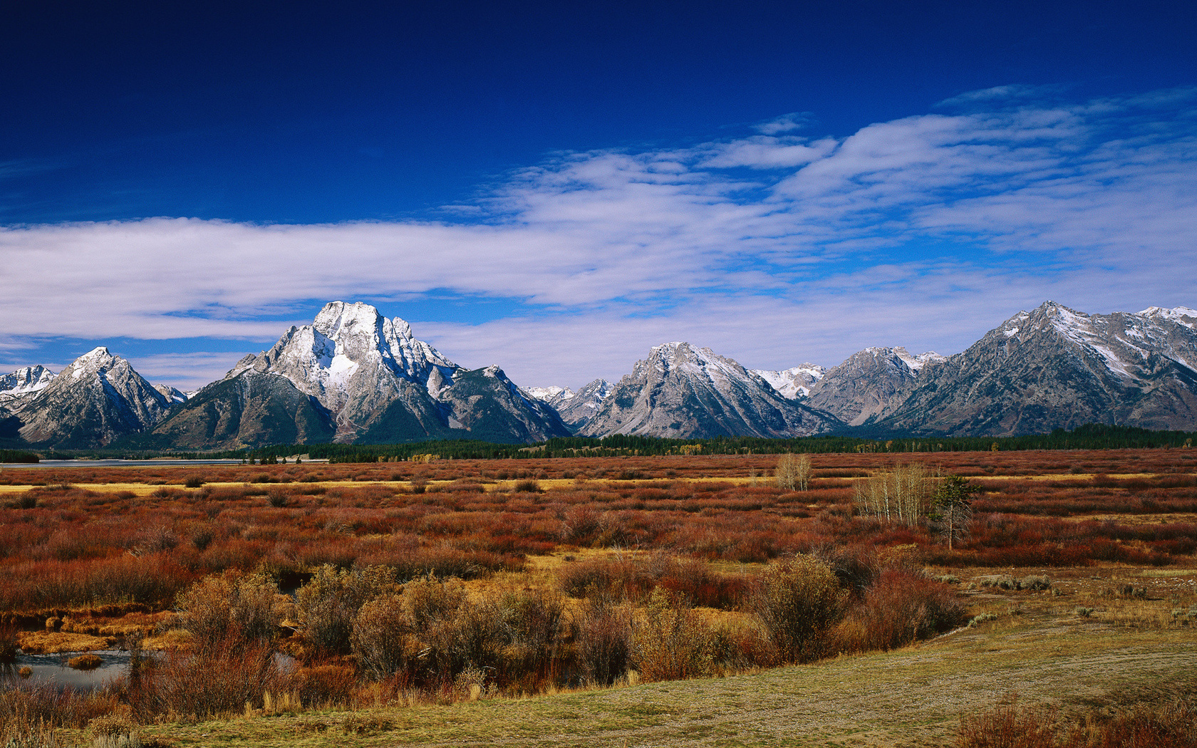 Description: A field with a river and mountains in the background with a blue sky and clouds above it and a few trees.