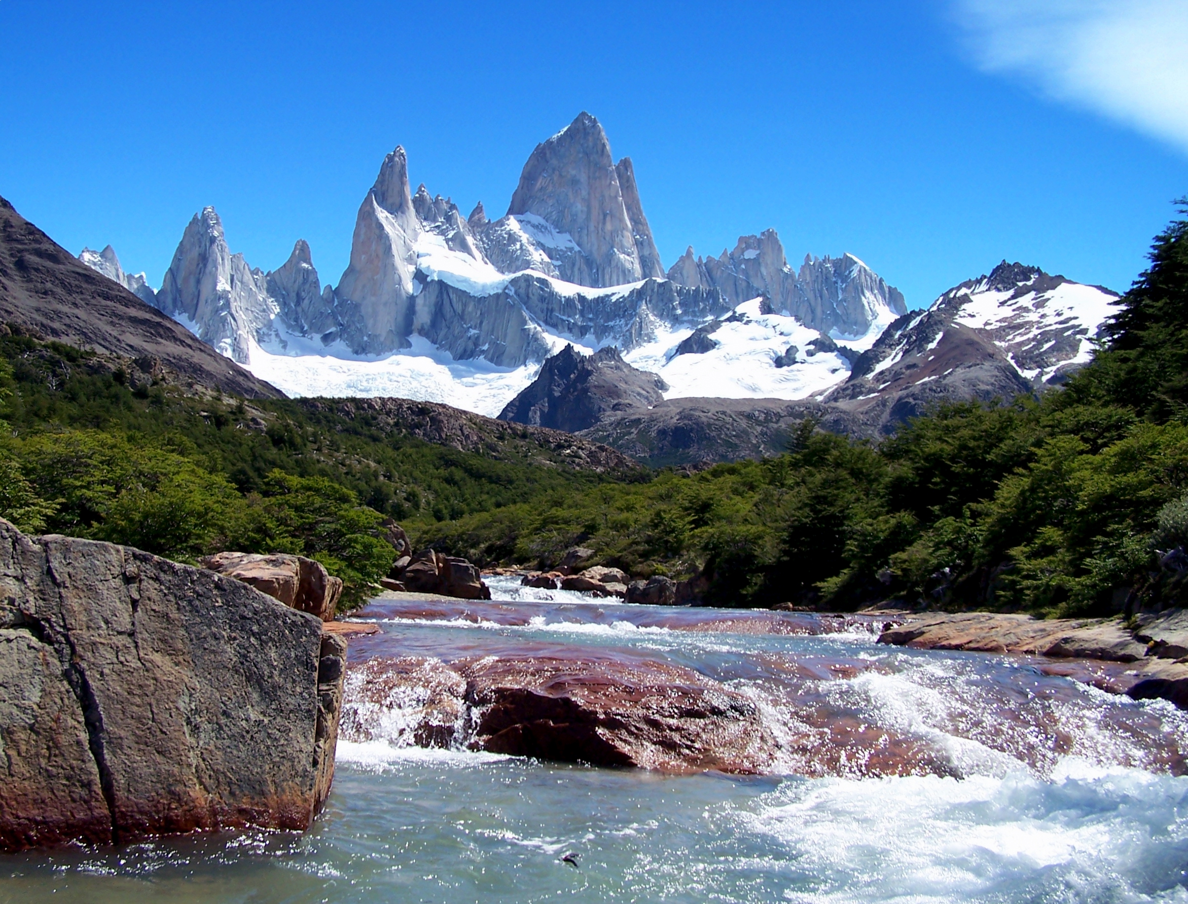 Description: A mountain range with a river running between it and a forest area with rocks and water running between it.