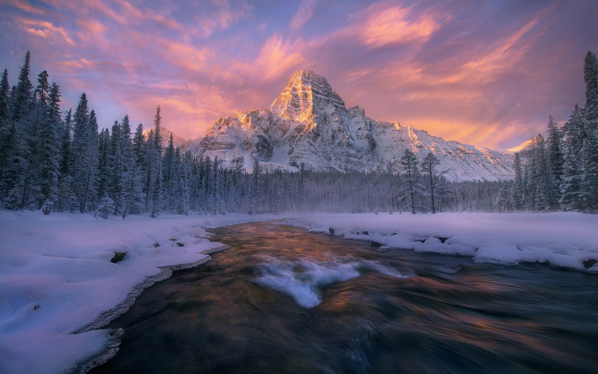 Description: A mountain is shown with a river running through it in the snow and trees around it.