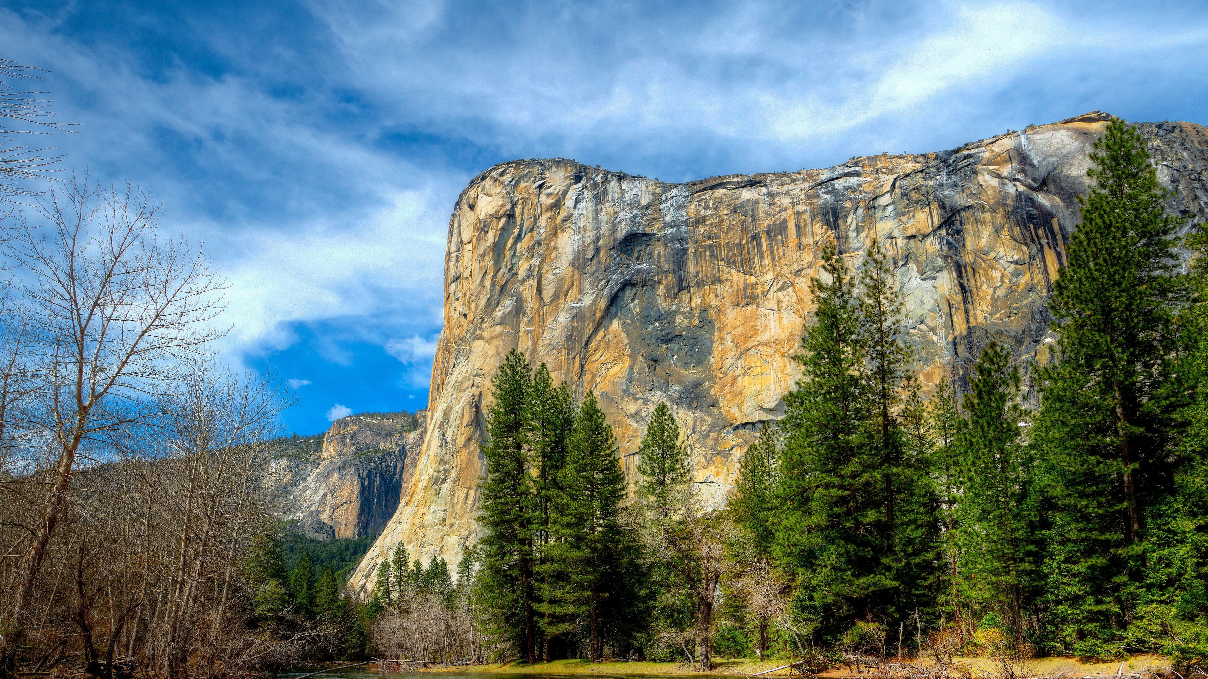 Description: A mountain with a river running through it and trees in the foreground and a blue sky with clouds.