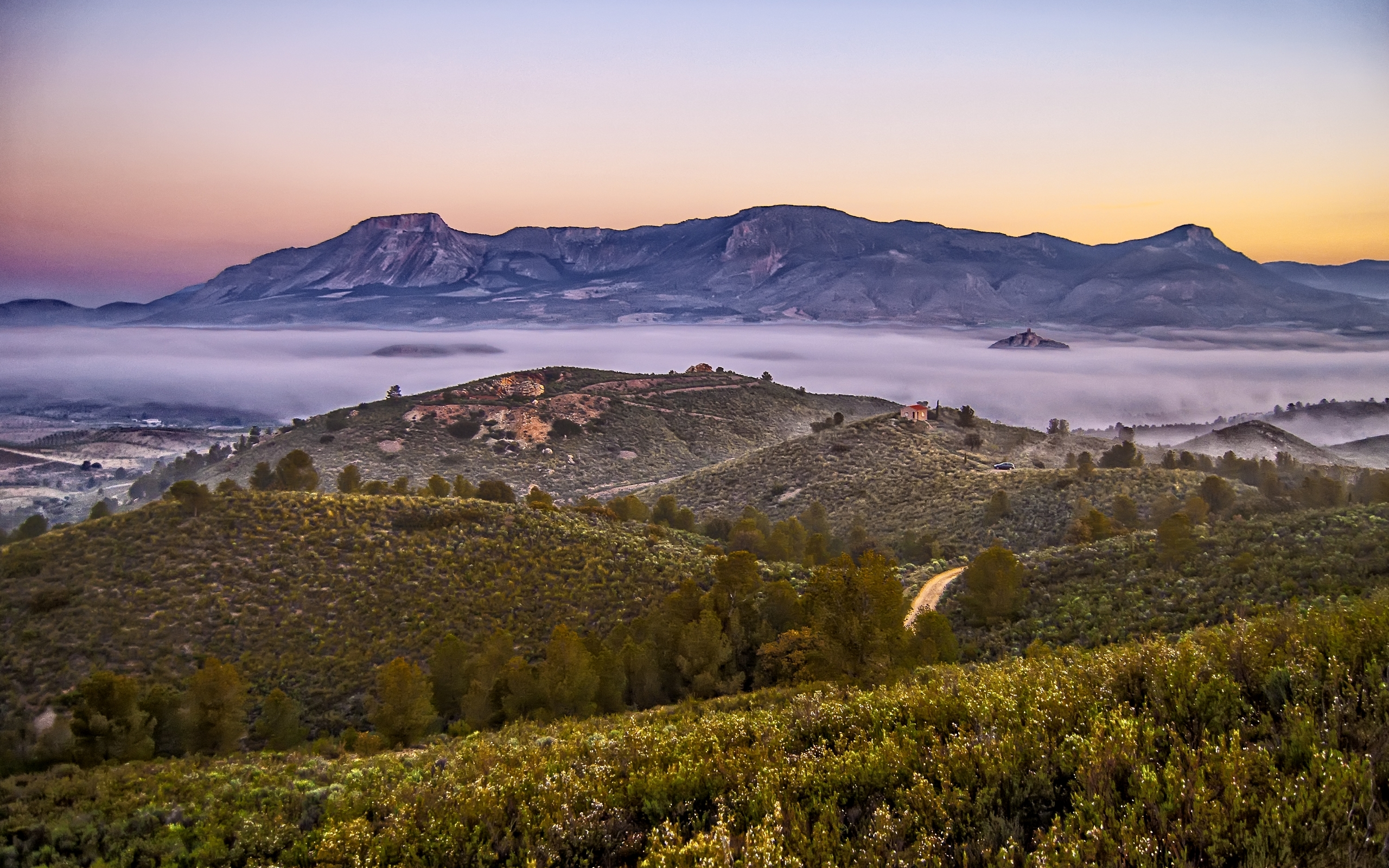 Description: A mountain with a road going through it and a foggy valley below it with a few trees on the side.